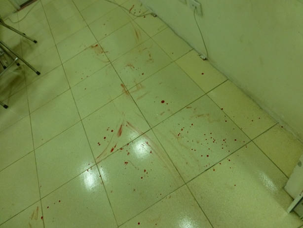 Tại hiện trường vẫn còn lưu lại nhiều vết máu ở trên bàn làm việc của chị Hiền, trên tường và sàn nhà. Điện thoại bàn đã bị văng xuống đất.