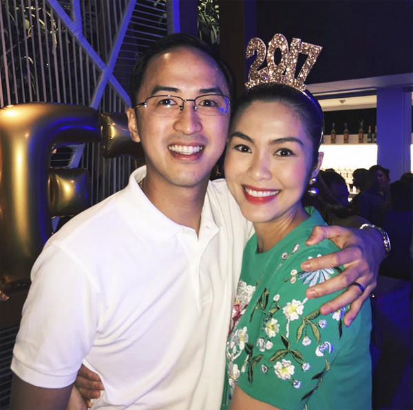 Vợ chồng Tăng Thanh Hà vui vẻ dự tiệc chúc mừng năm mới. |