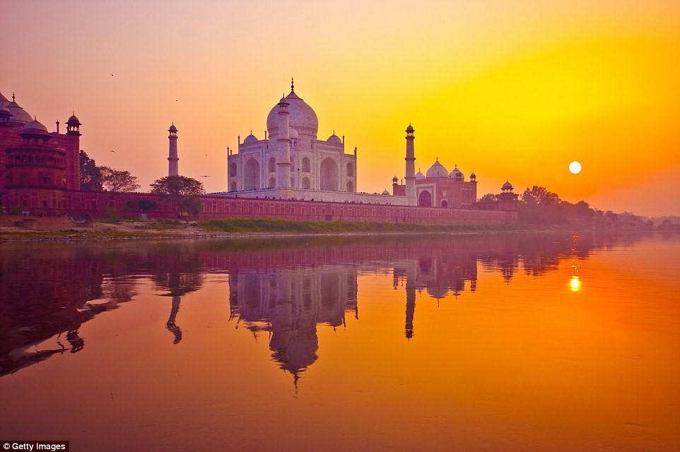 Khi mặt trời lặn sau lăng Taj Mahal của Ấn Độ, các mái vòm và tường cẩm thạch của công trình tuyệt mỹ này chuyển màu tím, giữa không gian lộng lẫy với ánh nắng màu cam ấn tượng.