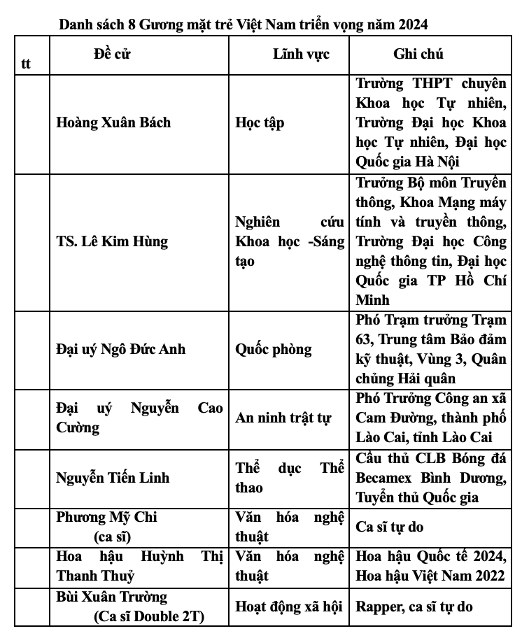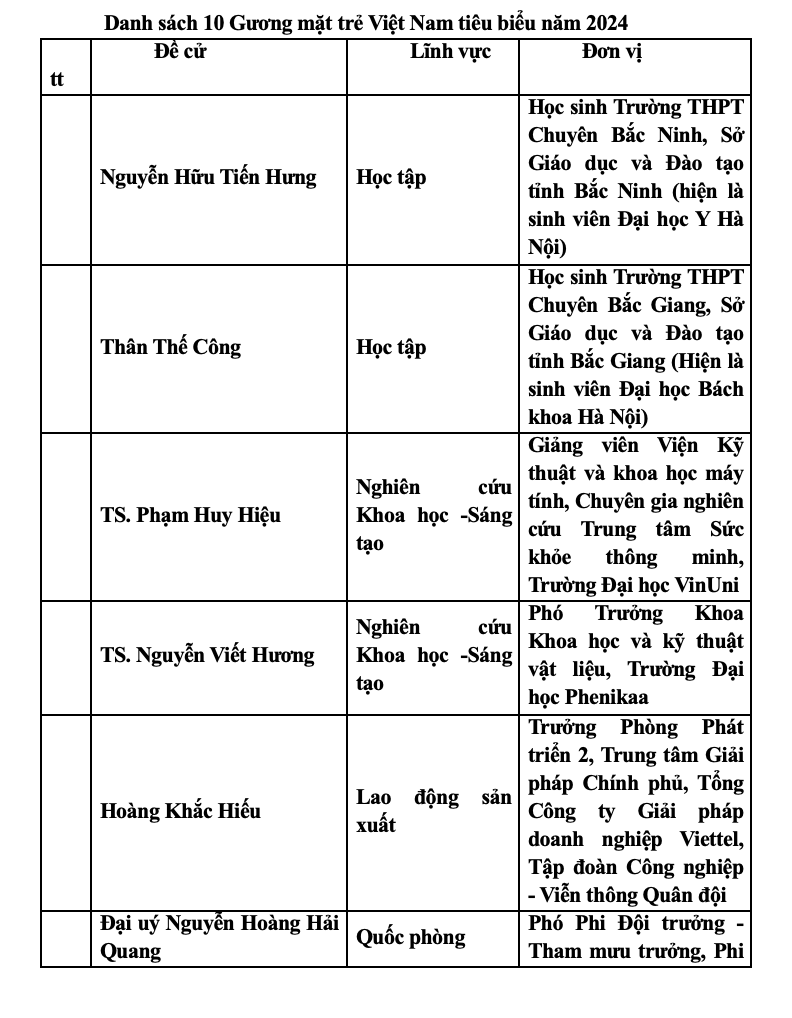 10 Gương mặt trẻ Việt Nam tiêu biểu năm 2024