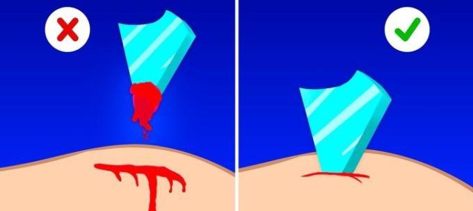 Lý do sai: Bạn có thể kéo mảnh vỡ từ ngón tay hoặc lấy mảnh thủy tinh nhỏ ra khỏi tay nhưng đừng cố lấy dị vật ra khỏi vết thương nghiêm trọng. Nếu không, máu sẽ chảy nhiều hơn và dẫn đến tử vong. Các bác sĩ thường giữ dị vật tại chỗ cho đến khi bệnh nhân được chuyển vào phòng phẫu thuật.