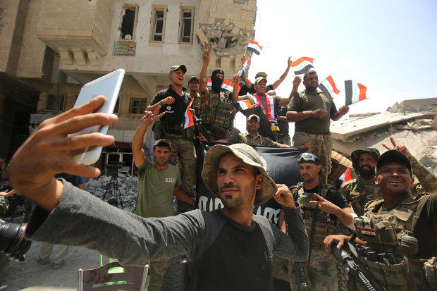 | Binh lính Iraq ăn mừng sự kiện IS bị đánh bại. Ảnh: EPA |