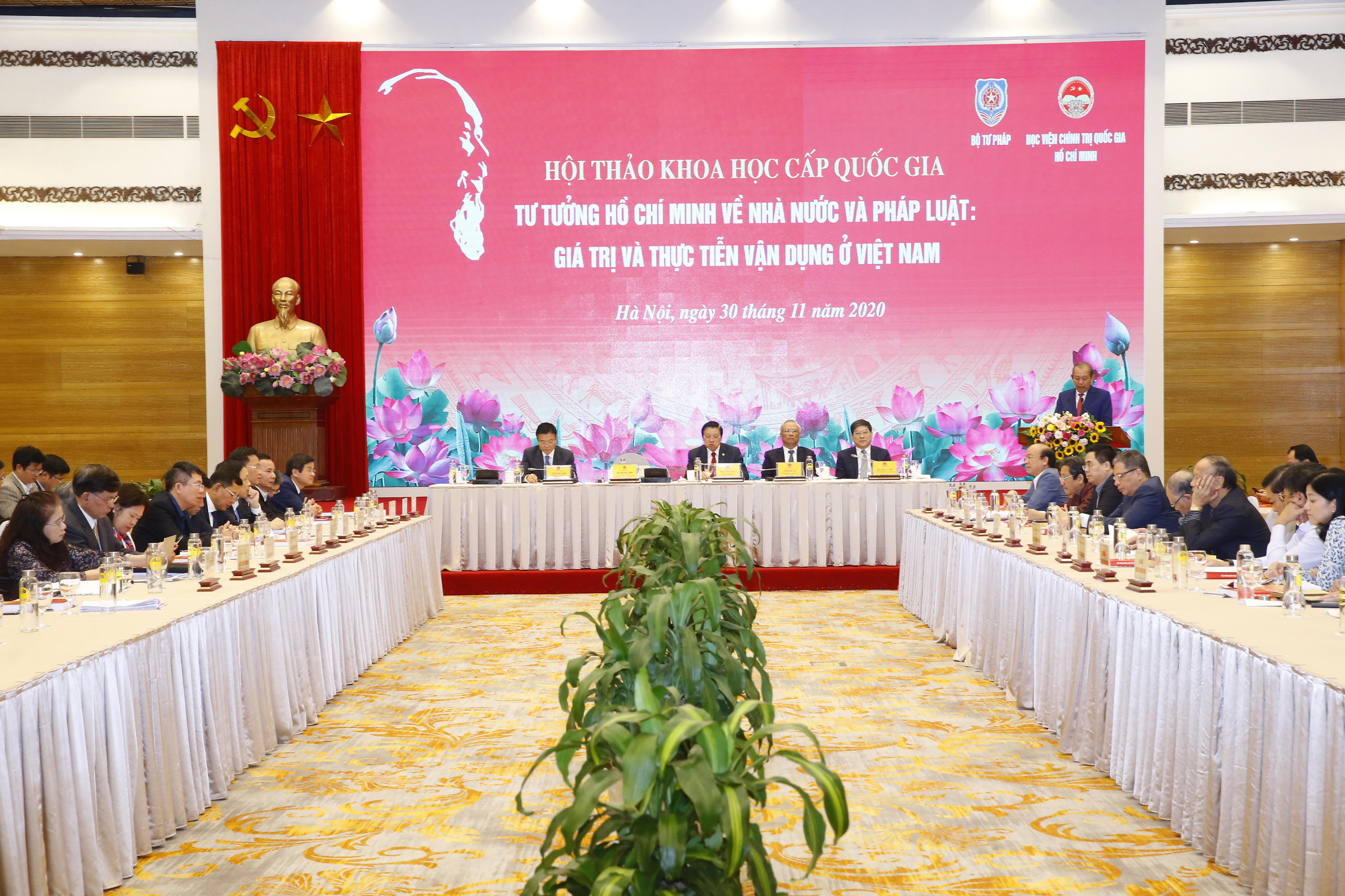 Thiết thực chào mừng Đại hội Đại biểu toàn quốc lần thứ XIII của Đảng, 75 năm ngày Quốc khánh nước Cộng hòa xã hội chủ nghĩa Việt Nam và 75 năm Ngày truyền thống ngành Tư pháp, ngày 30/11/2020, Bộ Tư pháp và Học viện Chính trị quốc gia Hồ Chí Minh đã tổ chức Hội thảo khoa học cấp quốc gia “Tư tưởng Hồ Chí Minh về Nhà nước và pháp luật: Giá trị và thực tiễn vận dụng tại Việt Nam”. Hội thảo là diễn đàn để nhận diện một cách đầy đủ, hệ thống, sâu sắc và toàn diện hơn nữa Tư tưởng Hồ Chí Minh về nhà nước và pháp luật; đánh giá kết quả và kinh nghiệm vận dụng Tư tưởng của Người trong sự nghiệp cách mạng và sự nghiệp Đổi mới vừa qua và đề xuất cho giai đoạn tới. Với sự quan tâm và hưởng ứng đông đảo của các ban, bộ, ngành Trung ương, chính quyền các tỉnh, thành phố trực thuộc trung ương và đông đảo các chuyên gia, nhà khoa học, nhà hoạch định chính sách cùng các cơ quan truyền thông, báo chí, Hội thảo đã góp phần lan tỏa rộng rãi những chỉ dẫn vô giá mà Chủ tịch Hồ Chí Minh để lại cho thế hệ cán bộ hiện nay về tư tưởng lấy dân làm gốc; về yêu cầu xây dựng một chính quyền mạnh mẽ và sáng suốt, một nhà nước pháp quyền xã hội chủ nghĩa thực sự của nhân dân, do nhân dân và vì nhân dân do Đảng Cộng sản Việt Nam lãnh đạo trên nền tảng “thần linh pháp quyền”; về yêu cầu xây dựng hệ thống pháp luật chứa đựng những giá trị công bằng, nhân văn, chính nghĩa, vì nhân dân lao động và vì con người, được tổ chức thực hiện nghiêm minh, để “giữ gìn quyền lợi của nhân dân” và duy trì trật tự xã hội.
