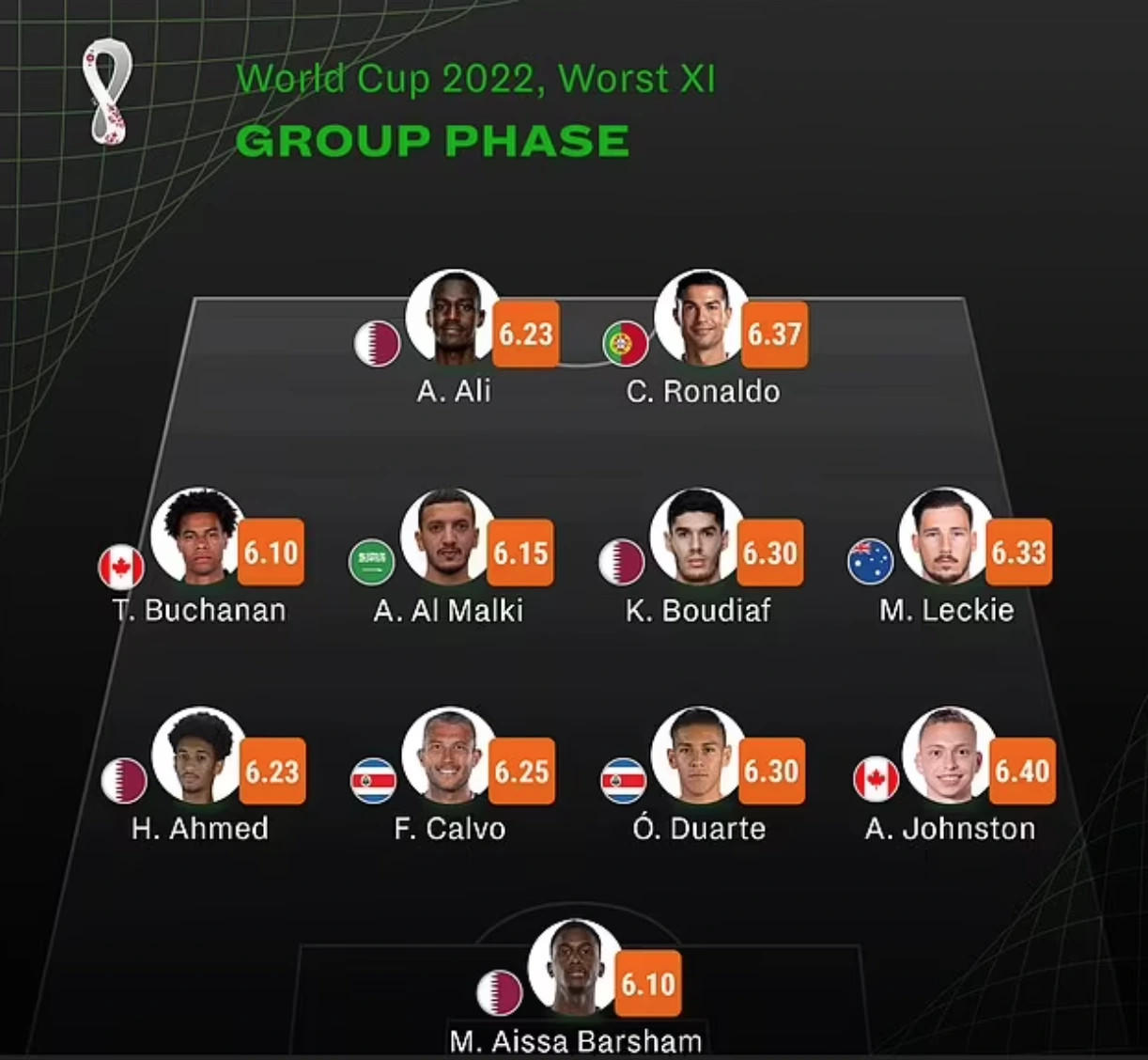 Cùng góp mặt với Ronaldo trong danh sách này là bốn cầu thủ của đội chủ nhà Qatar gồm: thủ môn Meshaal Barsham (6,10 điểm), hậu vệ Homam Ahmed (6,23 điểm), tiền vệ Karim Boudiaf (6,30 điểm) và tiền đạo Almoez Ali (6,23 điểm).