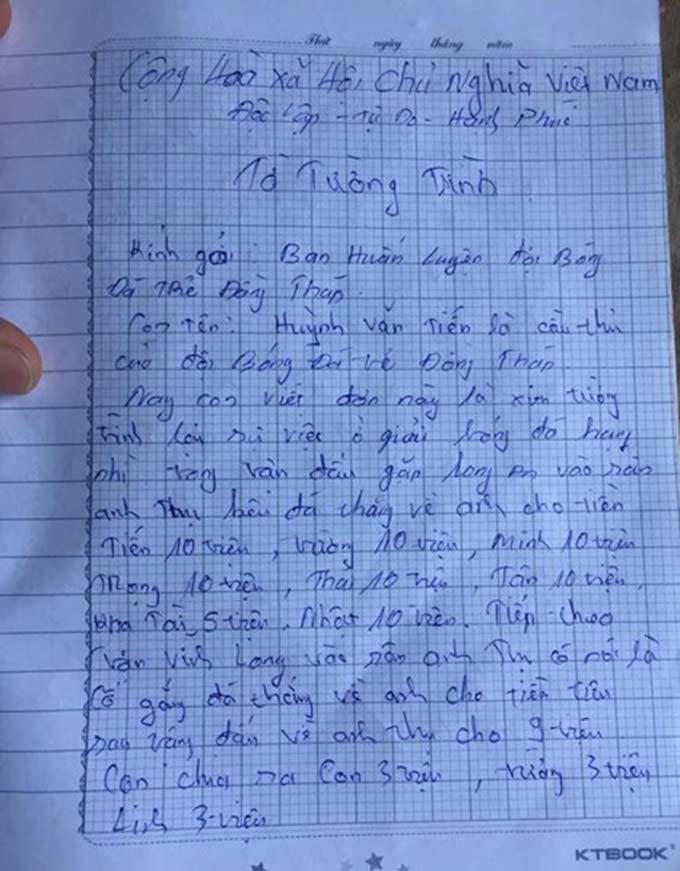 “Sau trận đấu, ăn được 133 triệu. Con chia cho anh em số tiền là: Tiến (Huỳnh Văn Tiến) - 15 triệu; Trường (Nguyễn Nhật Trường) - 13 triệu; Linh (Dương Vũ Linh): 10 triệu; Kha Tài (Kha Tấn Tài): 9 triệu; Huy (Lê Nhựt Huy): 15 triệu; Hoài (Cao Tấn Hoài): 13 triệu; Sô Ny (Giang Sô Ny): 10 triệu; Nghĩa (Trần Hữu Nghĩa): 7 triệu; Trọng (Võ Minh Trọng): 10 triệu; Nhật: 13 triệu; Thái: 3 triệu…”, Bản tường trình của Tiến cho biết