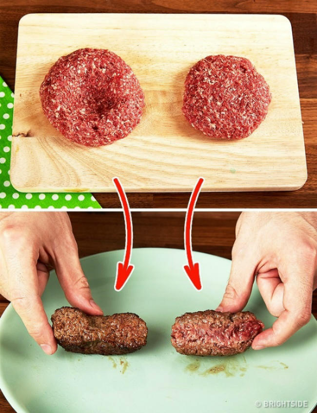 Khi rán thịt viên dày, nhiều người hay gặp tình huống bên ngoài chín nhưng bên trong thịt vẫn sống. Để giải quyết vấn đề này, hãy ấn lõm ở giữa viên thịt. Bạn không chỉ tiết kiệm được thời gian chế biến mà viên thịt cũng chín đều cả trong lẫn ngoài.