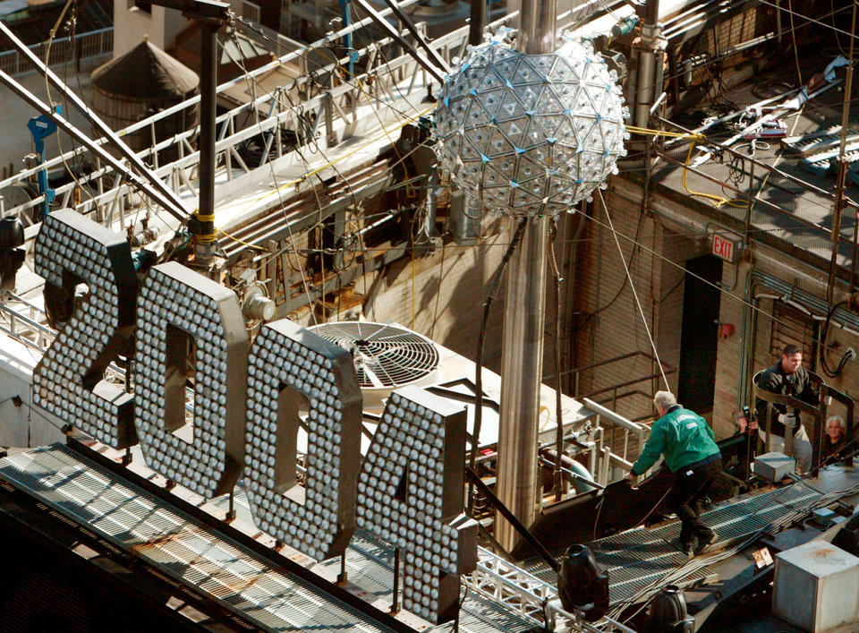 Từ sau năm 2000, quả cầu rơi ở Quảng trường Thời đại có những thay đổi đáng kể, trở nên phức tạp hơn trong thiết kế, lớn hơn về kích thước. Bức ảnh chụp năm 2003 là giây phút các công nhân kiểm tra quả cầu trang trí pha lê nặng gần 500 kg ở độ cao 121 m. Ảnh: Reuters.