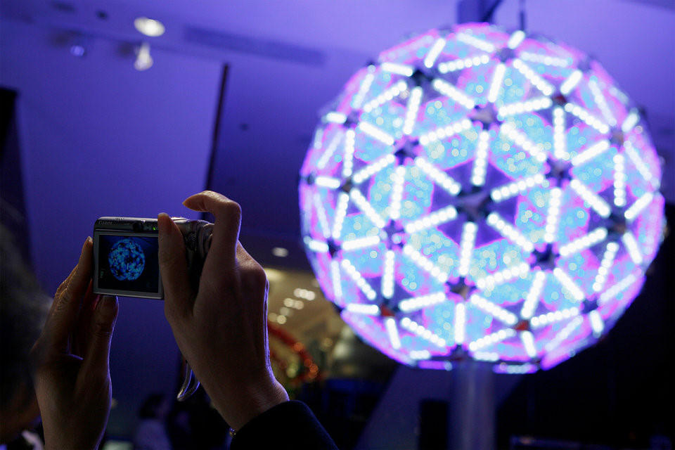2007: Đánh dấu 100 năm ra đời, Waterford Crystal và Philips Lighting đã thiết kế lại quả cầu rơi ở Quảng trường Thời đại với diện mạo hoàn toàn khác. Đèn LED được sử dụng, có thể thay đổi màu sắc và làm lóa mắt người xem từ xa, không giống bất kỳ bóng đèn nào của các phiên bản trước đó. Ảnh: Reuters.