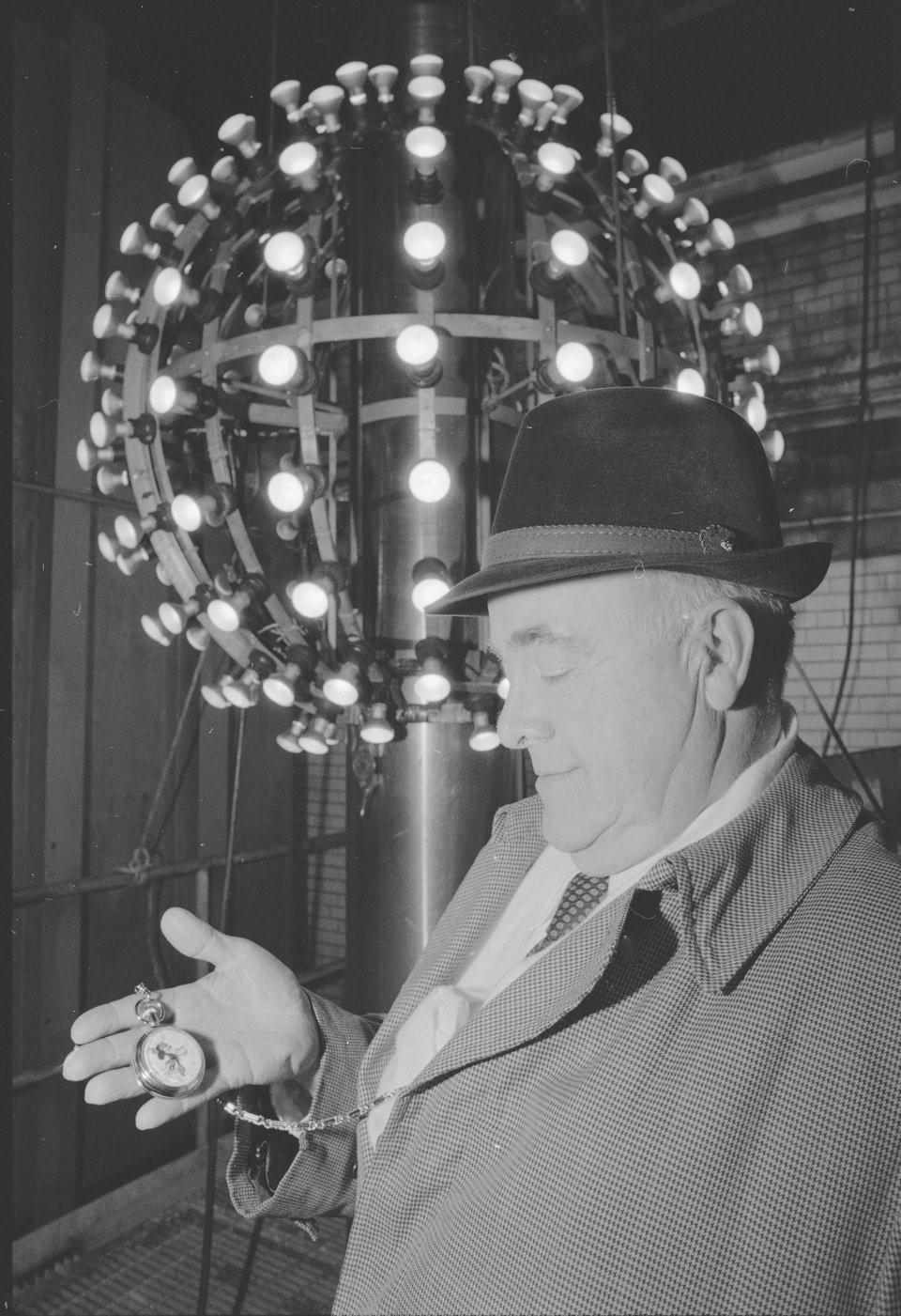 1955: Quả cầu rơi ở Quảng trường Thời đại được tái tạo và làm hoàn toàn bằng nhôm. Trong ảnh là Russ Brown, giám đốc tòa nhà One Times Square cùng quả cầu rơi bằng nhôm chỉ nặng gần 70 kg, nhẹ hơn rất nhiều so với các phiên bản trước đó. Ảnh: AP.