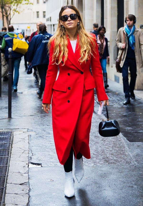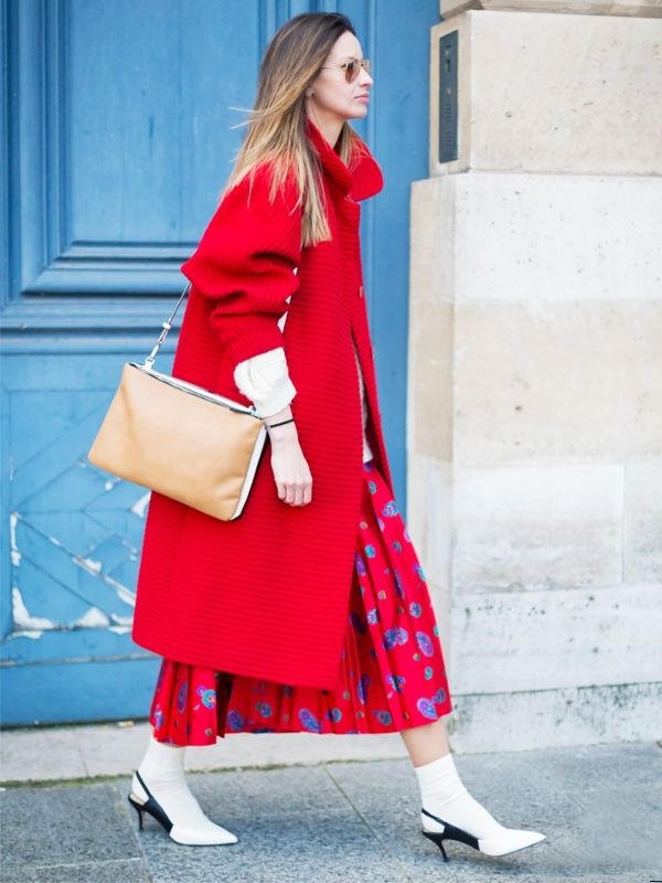 Màu đỏ không chỉ là xu hướng của nửa cuối năm 2017 mà còn tiếp tục được sủng ái trong năm nay. Nếu lười phối đồ, hãy chọn áo khoác măng tô dáng váy đỏ rực, đi kèm tất đen, bốt trắng. Xách chiếc túi có hình dáng độc đáo, bạn sẽ khiến người khác phải ngoái nhìn.