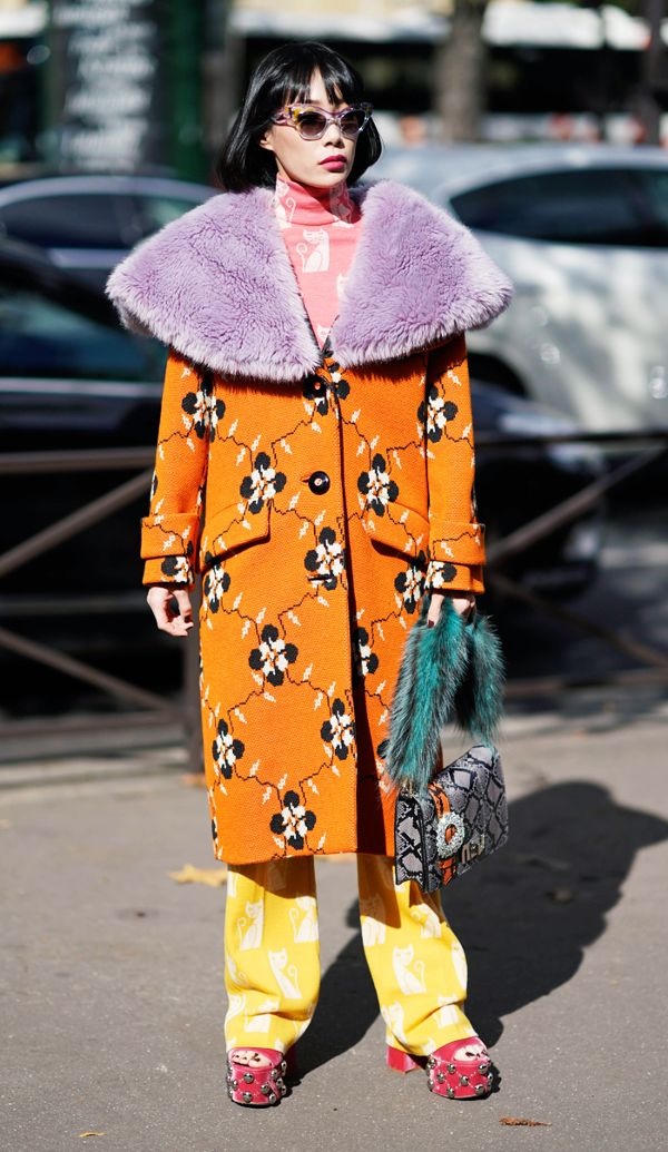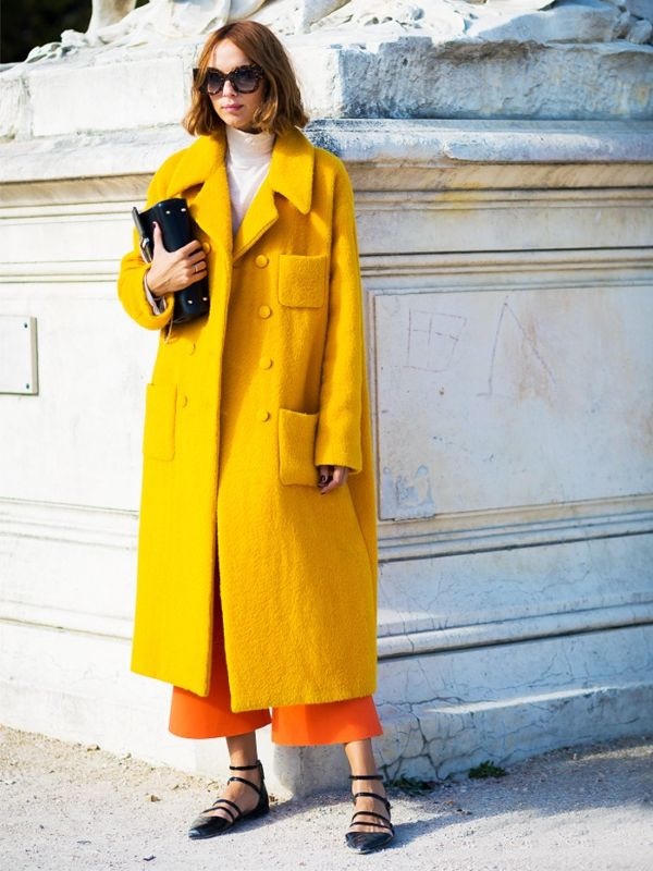 Mùa đông, trong khi nhiều người chọn tông đen, bạn hãy chọn các gam màu nổi của nhiệt đới để đem tới vẻ tươi mới, cuốn hút. Bạn có thể tham khảo cách phối: áo khoác dạ màu vàng, quần lửng ống rộng màu cam và áo cổ lọ trắng.