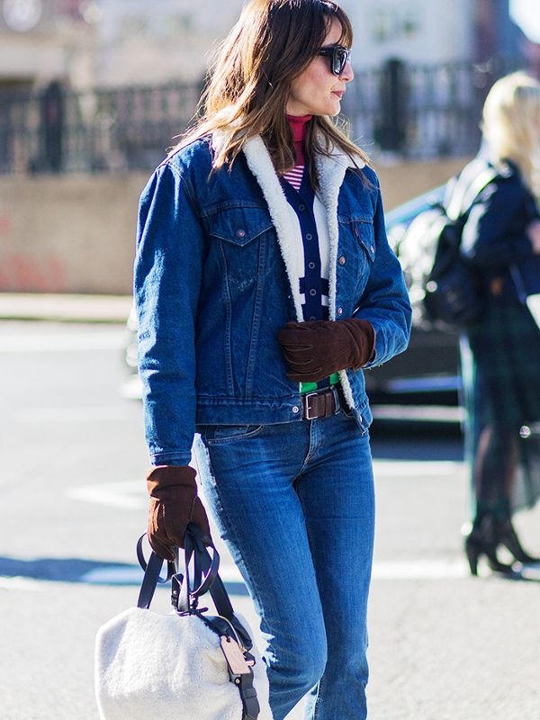 Denim là một trong những xu hướng hot của Xuân Hè năm nay. Đây cũng là chất liệu có thể mặc trong mọi thời tiết. Vào những ngày lạnh, các cô gái có thể chọn áo khoác denim lót bông, lông thú bên trong, mặc cùng quần jeans đồng màu. Bên trong, bạn có thể mặc áo len cổ lọ, áo giữ nhiệt. Trong trường hợp này, một chiếc túi lông cùng găng tay da lộn sẽ giúp bạn ghi thêm điểm phong cách.