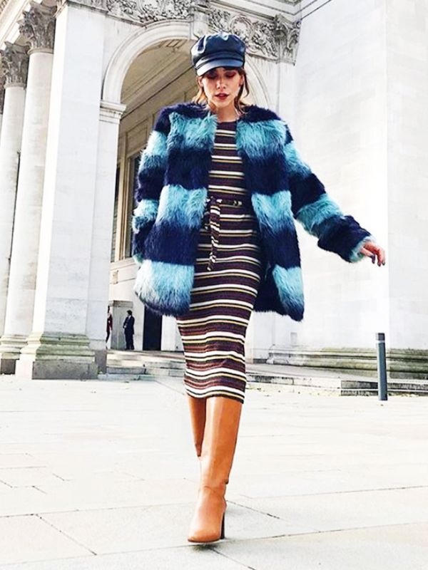 Những cô gái chuộng vẻ thanh lịch cổ điển, hãy thử kết hợp váy liền thân dáng dài chất nhung hoặc dạ, kèm áo khoác lông, mũ baker boy đang hot và bốt cao đến gối.