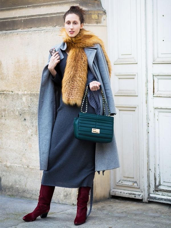 Với phong cách tối giản, bạn có thể chọn váy len liền thân dáng dài, bốt da lộn, áo măng tô. Để không bị đơn điệu, hãy chọn khăn quàng lông màu nổi, vừa giữ ấm vừa toát lên vẻ sang trọng, kiêu kỳ.
