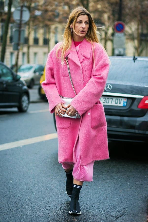 Mặc cả cây màu hồng cũng là một gợi ý của năm nay. Đi kèm với áo váy màu hồng, thay vì chọn bốt kiểu dáng nữ tính quen thuộc, bạn hãy chọn bốt thể thao.