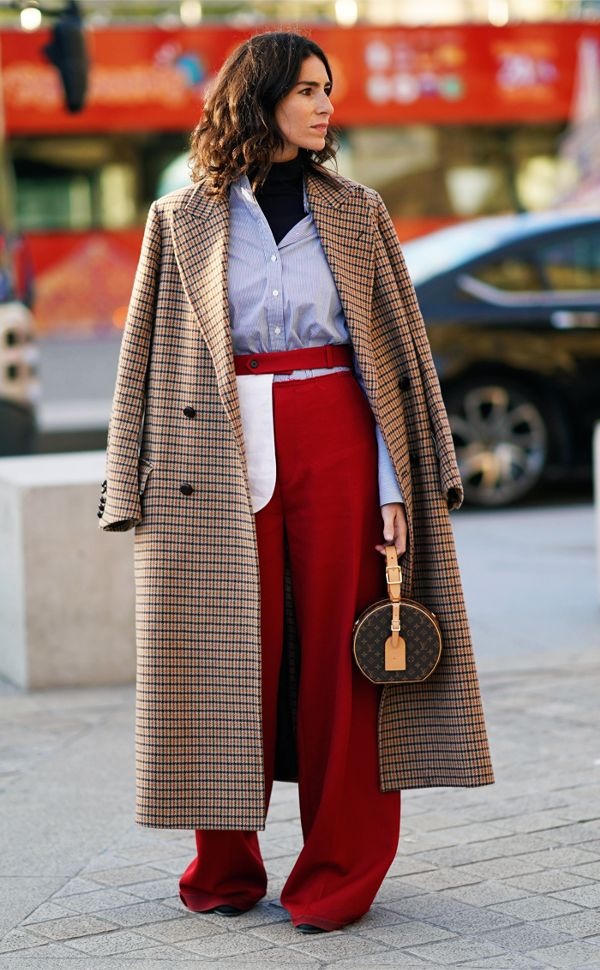 Với cách mix nhiều lớp, bạn có thể chọn áo cổ lọ mặc bên trong, sơ mi bên ngoài. Cả hai cùng sơ vin với quần suông ống rộng, cạp cao. Trên nền trang phục không họa tiết, điểm nhấn lúc này rơi vào chiếc áo măng tô kẻ ngoài cùng.
