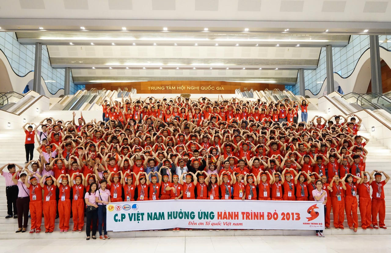 Các tình nguyện viên áo hồng CP và “Hành trình Đỏ” chụp ảnh lưu niệm vào năm 2013 |