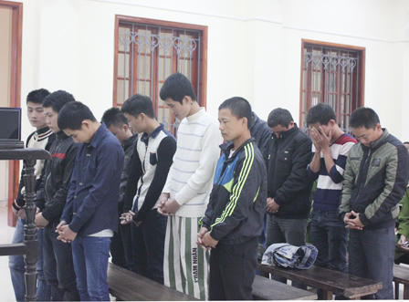 12 bị cáo đưa ra xét xử lần này gồm: Ngô Văn Hùng (SN 1996); Nguyễn Văn Điểm (SN 1996); Nguyễn Văn Huấn (SN 1996); Nguyễn Văn Sửu (SN 1997); Nguyễn Văn Hải (SN 1994); Nguyễn Thọ Trí (SN 1980); Nguyễn Thúc Hợi (SN 1983) và Nguyễn Thúc Tiến (SN 1985 đều trú tại Đại Sơn, Đô Lương, Nghệ An); Nguyễn Văn Hùng (SN 1995, trú tại xã Hiến Sơn, Đô Lương); Trương Văn Tiến (SN 1988, trú tại xã Nghi Văn, Nghi Lộc); Nguyễn Đức Danh (SN 1990); Hoàng Văn Lợi (SN 1989 đều trú tại Nghi Kiều, Nghi Lộc).