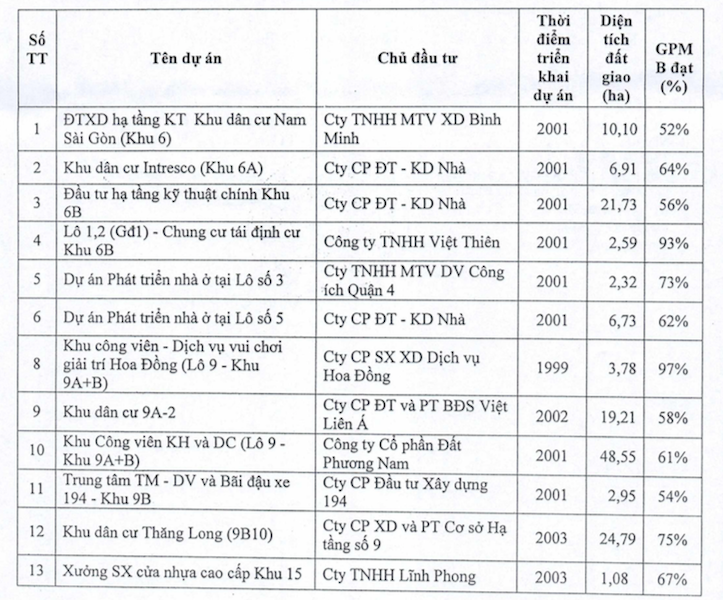 Theo đó, kiến nghị Thủ tướng xem xét thu hồi 13 dự án tại TP HCM đã giao đất từ những năm 1999 - 2003 nhưng đến nay chưa hoàn thành việc giải phóng mặt bằng (GPMB) chưa thực hiện nghĩa vụ tài chính, chưa đầu tư xây dựng.
