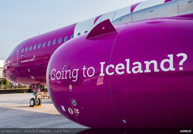 | Chiếc máy bay của hãng Wow Air nổi bật trên nền trời với tông màu hồng tím trẻ trung và sôi nổi cùng với lời mời gọi tới vùng đất Iceland xinh đẹp |
