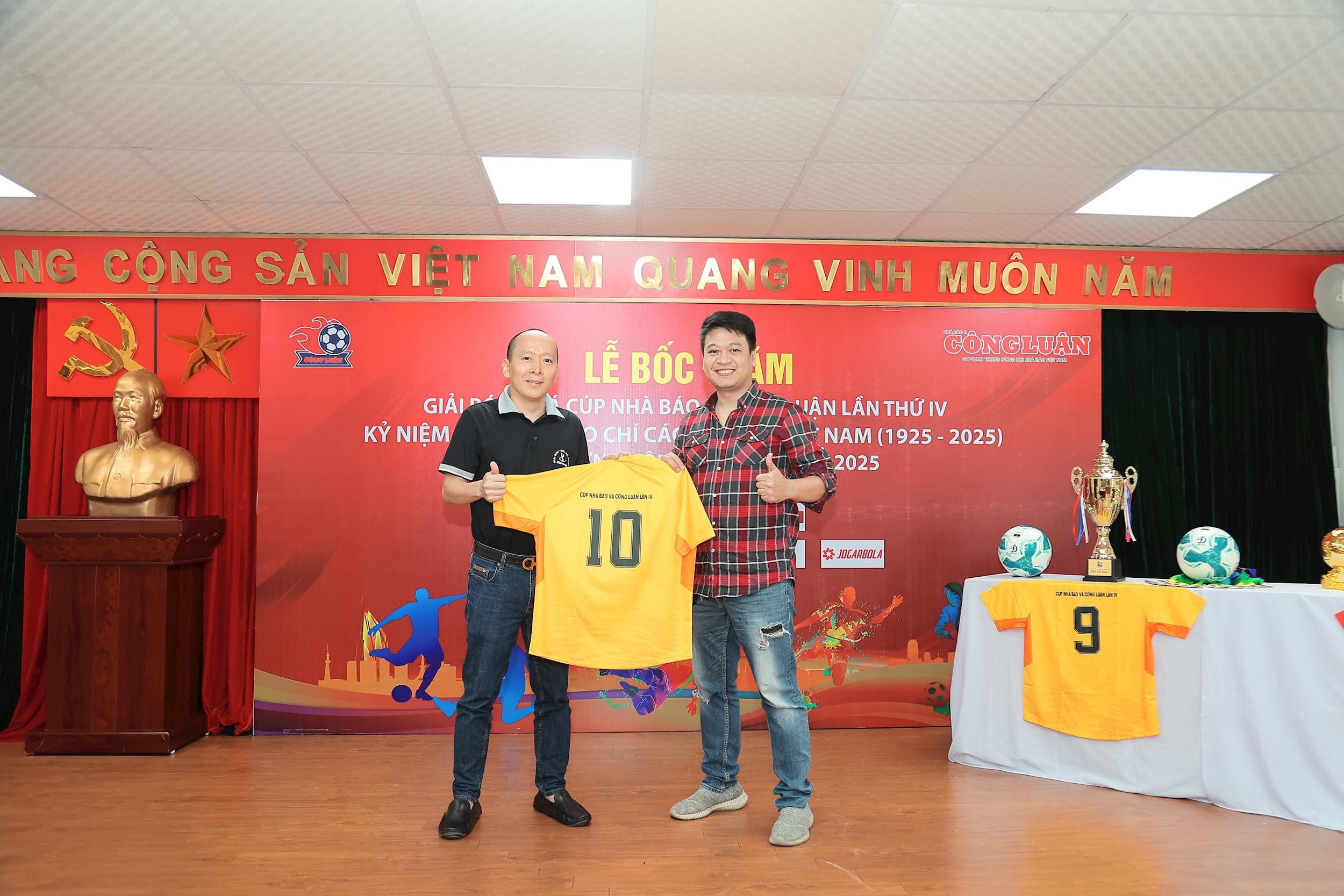 Nhà báo Quán Tuấn, đại diện Ban tổ chức trao áo đấu cho đại diện đội bóng báo Nhân Dân. |