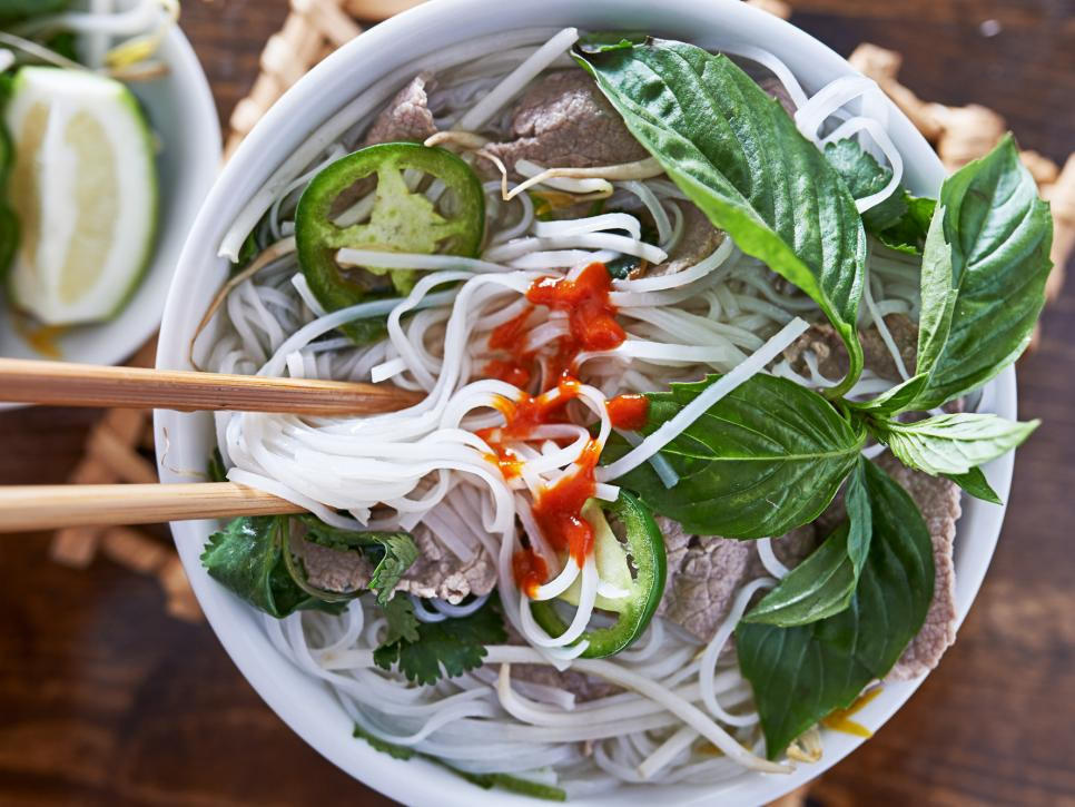 Phở: Món phở làm từ mì gạo truyền thống của các quán ăn ven đường rất phổ biến ở châu Á. Nước dùng đun sôi, ninh từ thịt lợn, gà hoặc bò, chan vào bánh phở hoặc để trong một bát riêng. Bánh phở đặt vào trong bát, bên trên là thịt bò thái mỏng, tôm, mực, hoặc thịt lợn, thật nhiều giá đỗ, thêm chút hành phi, hoặc dấm tỏi, rau thơm thái nhỏ như húng quế hoặc rau mùi, vắt miếng chanh. Ảnh: Rezart/Getty Images.