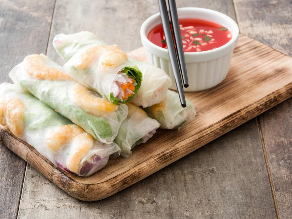 Nem cuốn: Còn được gọi là salad cuốn, hoặc nem cuốn sống, những nguyên liệu tươi ngon gồm tôm, xà lách, cà rốt, dưa chuột và lá bạc hà được cuộn gọn trong chiếc bánh đa nem mềm. Bạn có thể thay tôm bằng thịt gà, thịt lợn thái sợi, hoặc đậu phụ. Nem cuốn chấm với nước mắm pha rắc đậu phộng giã nhỏ, hoặc nước sốt đậu phộng. Ảnh: Etorres69/Getty Images.