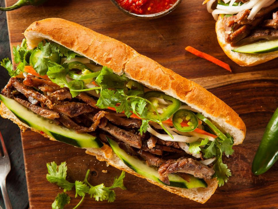 Bánh mì: Như sandwich kiểu Pháp, món ăn có thể thay bữa trưa khoái khẩu này của Việt Nam sử dụng một ổ bánh mì nhỏ, rạch dọc thân bánh, nhồi cà rốt, củ cải muối, rau sống, rau mùi, tương ớt, giò, pate và/hoặc kèm một miếng thịt lợn quay thơm mùi sả. Ảnh: Bhofack2/Getty Images.