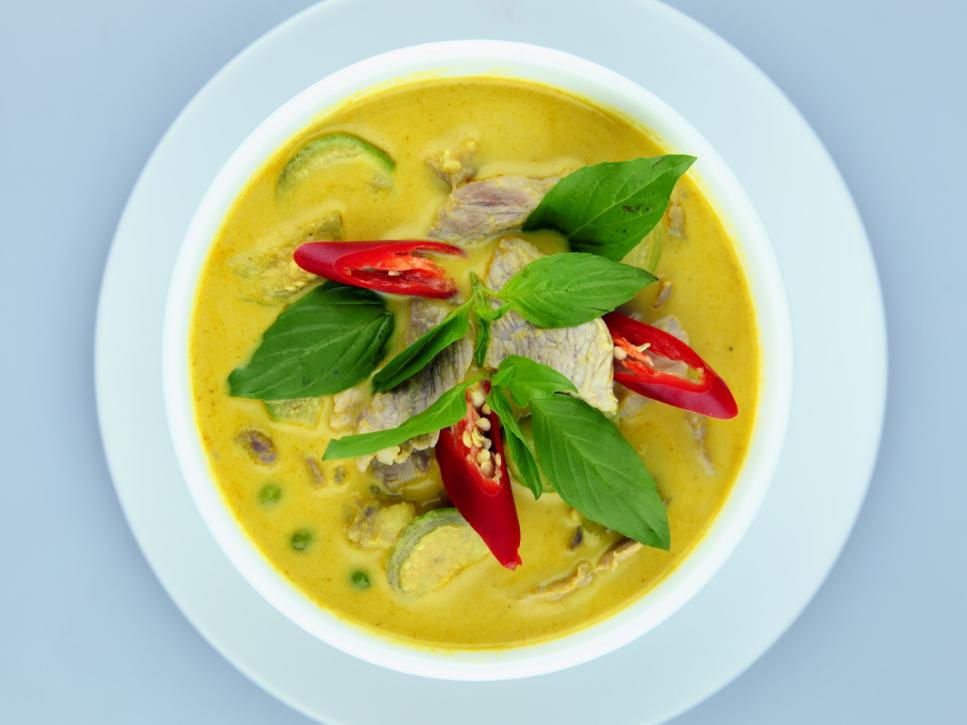 Cà ri: Cà ri chiếm một vị trí quan trọng trong nền ẩm thực Đông Nam Á. Từ vị cay nhẹ đến cực cay nồng, đầu bếp thường bắt đầu từ bước đun chảy dầu dừa, và đảo nóng một loại sốt cay - chế từ sả, lá chanh Thái, tỏi, nghệ và củ riềng, với các gia vị khô bao gồm hạt rau mùi, hạt cỏ cà ri - kết hợp cùng thịt hoặc rau. Sau đó, cho nước cốt dừa và đôi lúc cả thịt vào nấu tiếp. Hạ nhỏ lửa cho đến khi hỗn hợp sánh nhẹ. Cà ri ăn kèm với cơm gạo trắng hạt dài, gạo hạt ngắn, hoặc bánh mì Pháp. Ảnh: Darren Rowley/Getty Images.