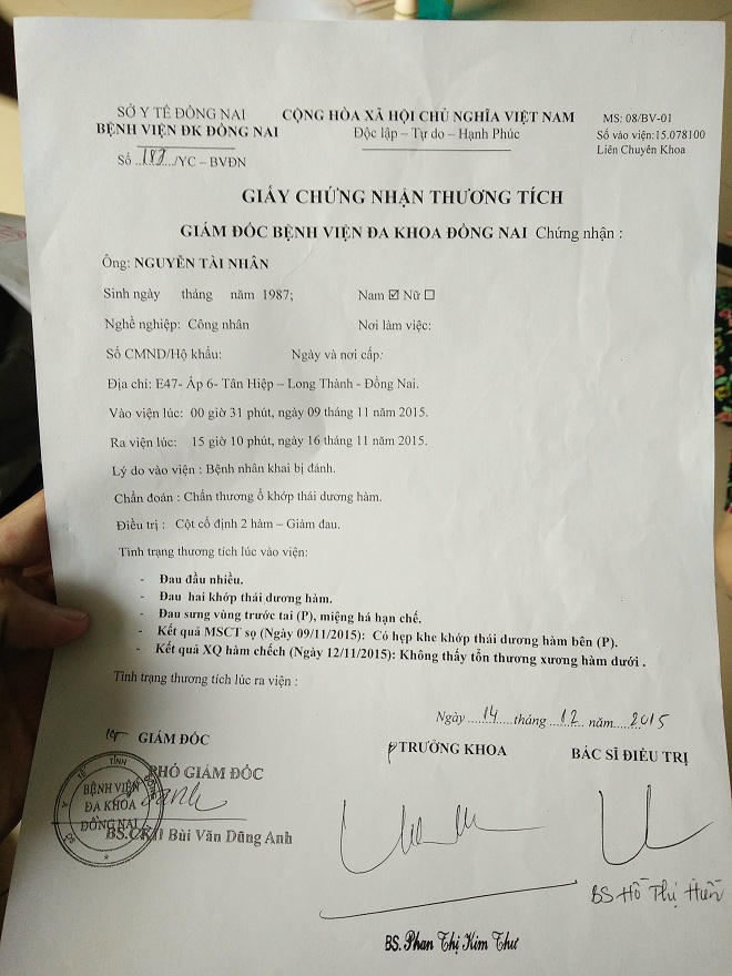 Với giấy chứng nhận thương tích “chấn thương ổ khớp thái dương hàm” của bệnh viện đa khoa Đồng Nai, tra cứu thông tư liên tịch 28/2013 của Bộ Y Tế ngày 27/9/2013, anh Nhân cho rằng tổn thương này có tỷ lệ từ 21% đến 40%.