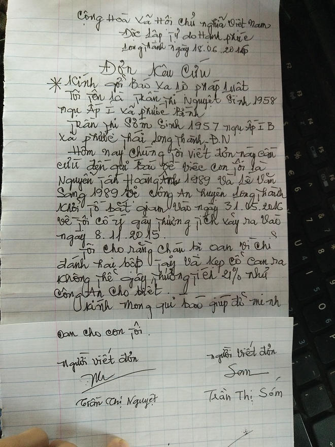 Bà Trần Thị Nguyệt (SN 1958, ngụ ấp 1, xã Phước Bình) và bà Trần Thị Sớm (SN 1957, ngụ ấp 1B, xã Phước Thái, huyện Long Thành, tỉnh Đồng Nai) vừa đồng thời có đơn kêu cứu tới báo XLPL. Hai người phụ nữ này cho rằng con mình là Nguyễn Trần Hoàng Ân (SN 1989) và Lê Văn Sang (SN 1989) bị cơ quan chức năng khởi tố, bắt tạm giam oan.