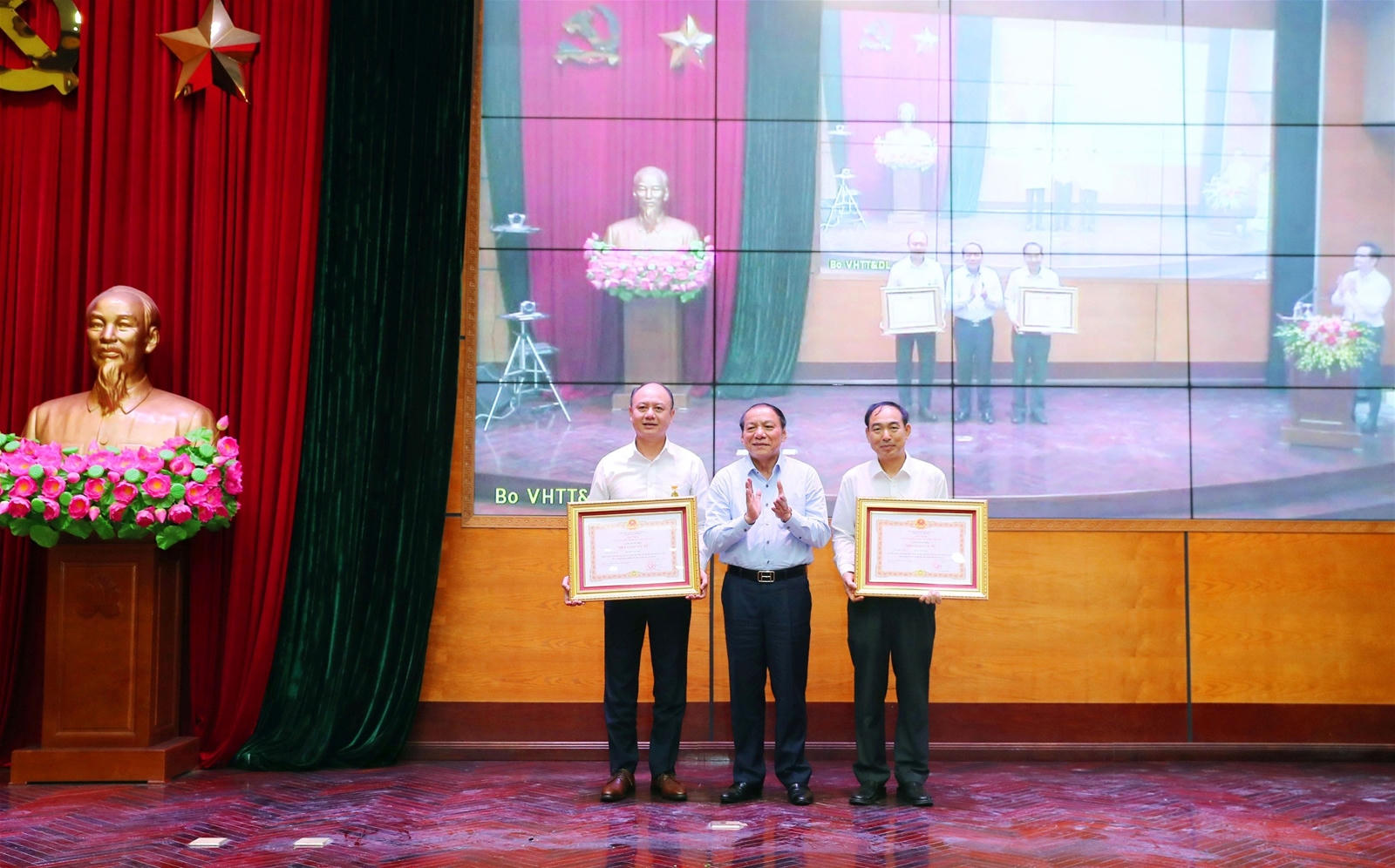 (PLVN) - Thừa ủy quyền của Chủ tịch nước, mới đây, Bộ Trưởng Bộ Văn hóa, Thể thao và Du lịch Nguyễn Văn Hùng đã trao danh hiệu Nhà giáo ưu tú cho PGS.TS. Nguyễn Văn Phúc - Bí thư Đảng ủy, Hiệu trưởng và PGS. TS. Đặng Văn Dũng - Phó hiệu trưởng Trường ĐH TDTT Bắc Ninh.
