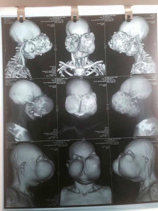 Bệnh nhân được chẩn đoán loạn sản xơ vùng xương hàm và mặt. Kết quả chụp cắt lớp vi tính cho thấy vùng hàm mặt có nhiều khối u, trong đó khối u lớn có kích thước 8x11x18 cm phát triển từ xương hàm trên và xương khẩu cái là một tập hợp từ nhiều khối u nhỏ, xâm lấn đè ép, phá hủy các hốc mắt hai bên, xương mũi… Các khối u này có cấu trúc không đồng nhất, chứa dịch mô xơ, vôi hóa.