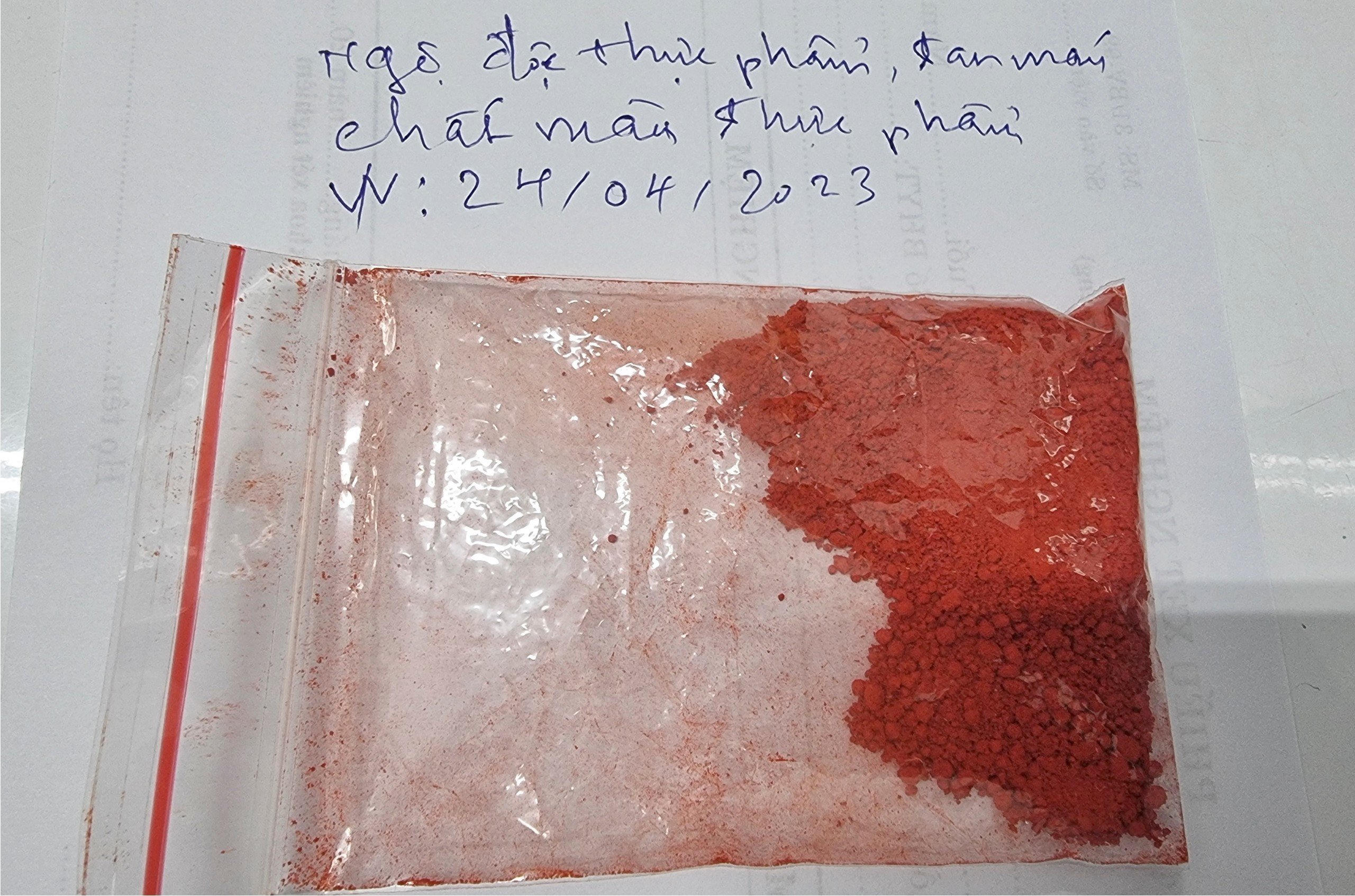 Mẫu bột màu thực phẩm được xét nghiệm phát hiện thấy có a xít orange 7 (4-[(2-Hydroxy-1-naphthyl) diazenyl] benzenesulfonic acid). Hóa chất a xít Orange 7 được dùng làm chất màu công nghiệp và phụ gia thực phẩm. Với liều cao trên động vật có thể gây tan máu và methemoglobin. Trên y văn chưa thấy có thông tin gây ngộ độc trên người.