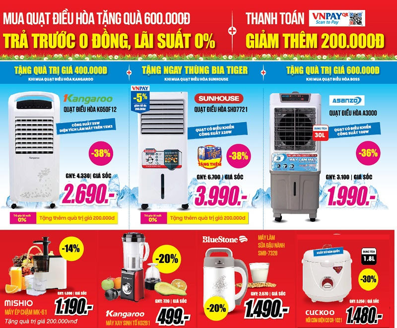 Mức giá giảm giá sâu còn được áp dụng cho các sản phẩm điện lạnh đang được chưa chuộng trên thị trường: Điều hòa 1 chiều 9.000BTU MDV được mệnh danh là điều hòa tiết kiệm điện giá rẻ nhất giảm 25% giá cực sốc 5.990.000đ; Điều hòa 1 chiều 9.000BTU Daikin Inverter FTC25NV1V giá cực sốc 8.490.000đ; Tủ lạnh Samsung 236 lít RT22FARBDSA/SV giảm 22% giá cực sốc 5.990.000đ; Tủ lạnh Panasonic 255 lít NR-BV289QSV2 giá khuyến mại 9.890.000đ… Chưa dừng ở đó, mua Điều hòa Miễn phí 100% công và vật tư lắp đặt, miễn phí 100% ống đồng tiêu chuẩn, tặng voucher trị giá đến 1.000.000đ, miễn phí bảo dưỡng, trả trước 0 đồng, trả góp 0 lãi suất; mua các loại tủ lạnh dung tích từ 200-300 lít được tặng ngay phiếu mua hàng 100.000đ, nồi cơm điện cao cấp Sharp; mua tủ lạnh side by side và 4-6 cánh được tặng ngay phiếu mua hàng 1.000.000đ, lò vi sóng cao cấp Sharp…