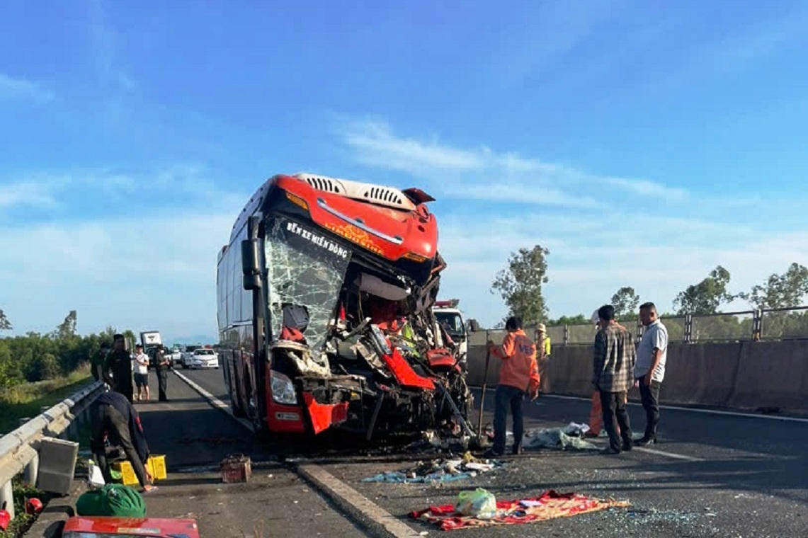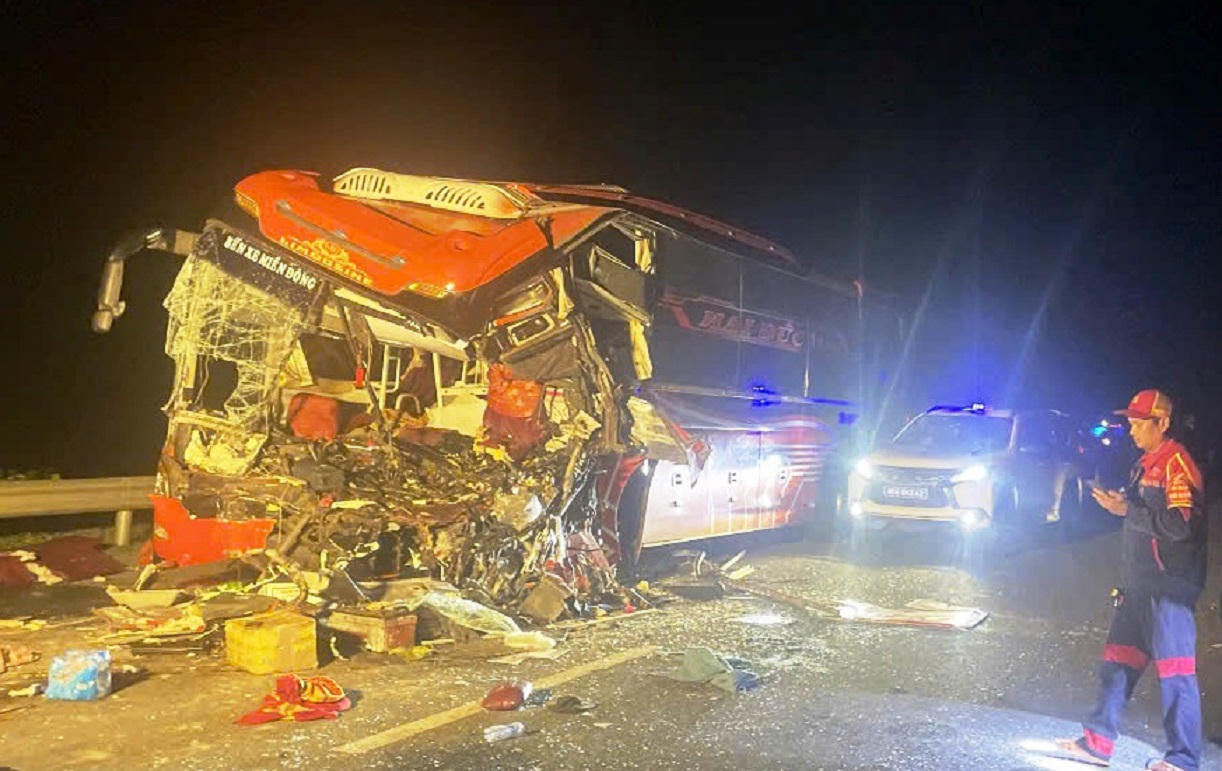 Cú va chạm mạnh khiến đầu xe khách bị biến dạng hoàn toàn, tài xế và phụ xe mắc kẹt trong cabin, tử vong tại chỗ, gần 20 hành khách khác trên xe bị thương.