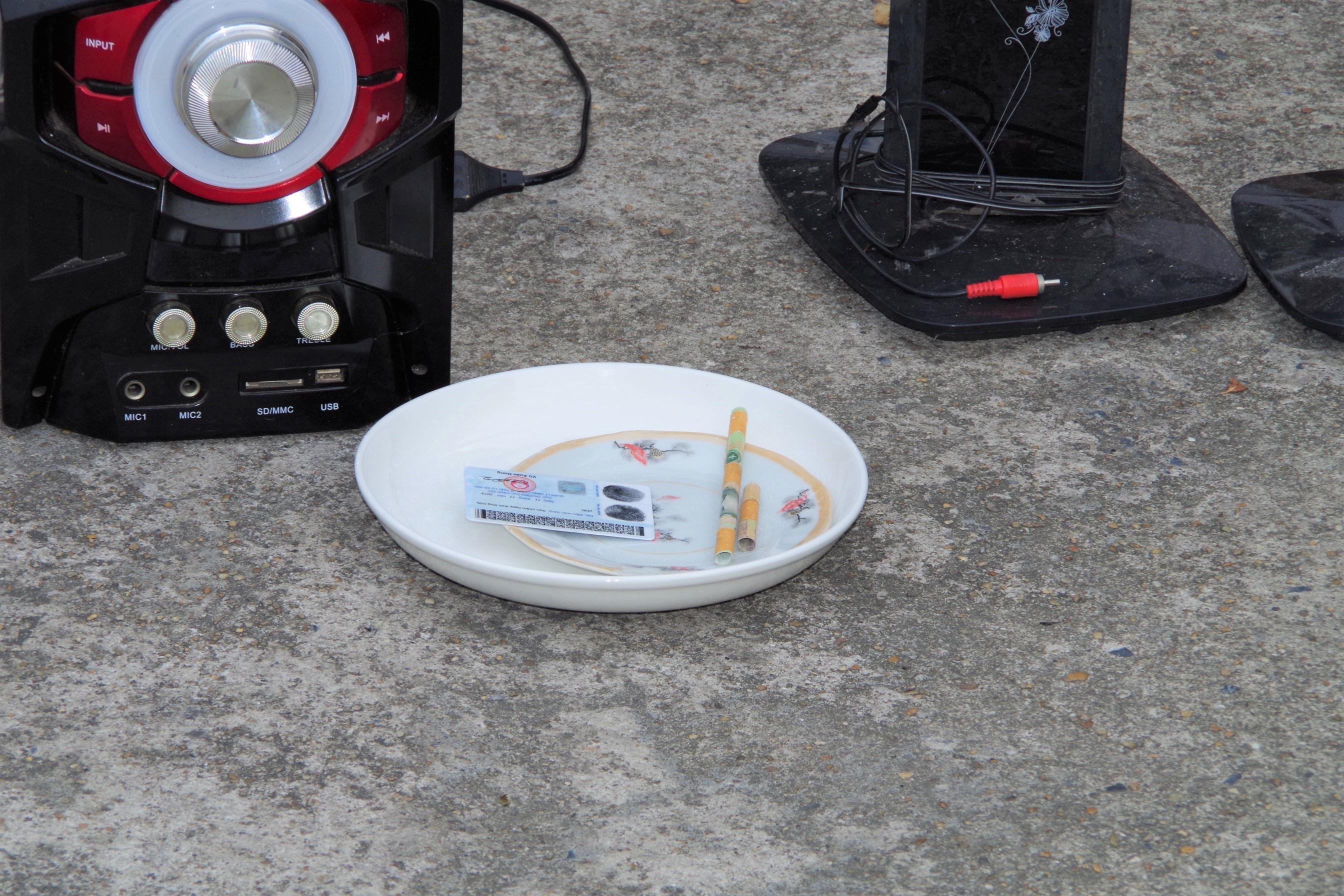 Tại hiện trường, lực lượng công an đã thu giữ 1 bật lửa gas, 2 đĩa sứ trắng trên mặt đĩa còn bám các hạt tinh thể màu trắng, 2 túi nilon màu trắng kích thước 3x2,5 cm, 2 ống được cuộn bằng tờ tiền polime mệnh giá 100.000 đồng, 1 thẻ căn cước công dân.