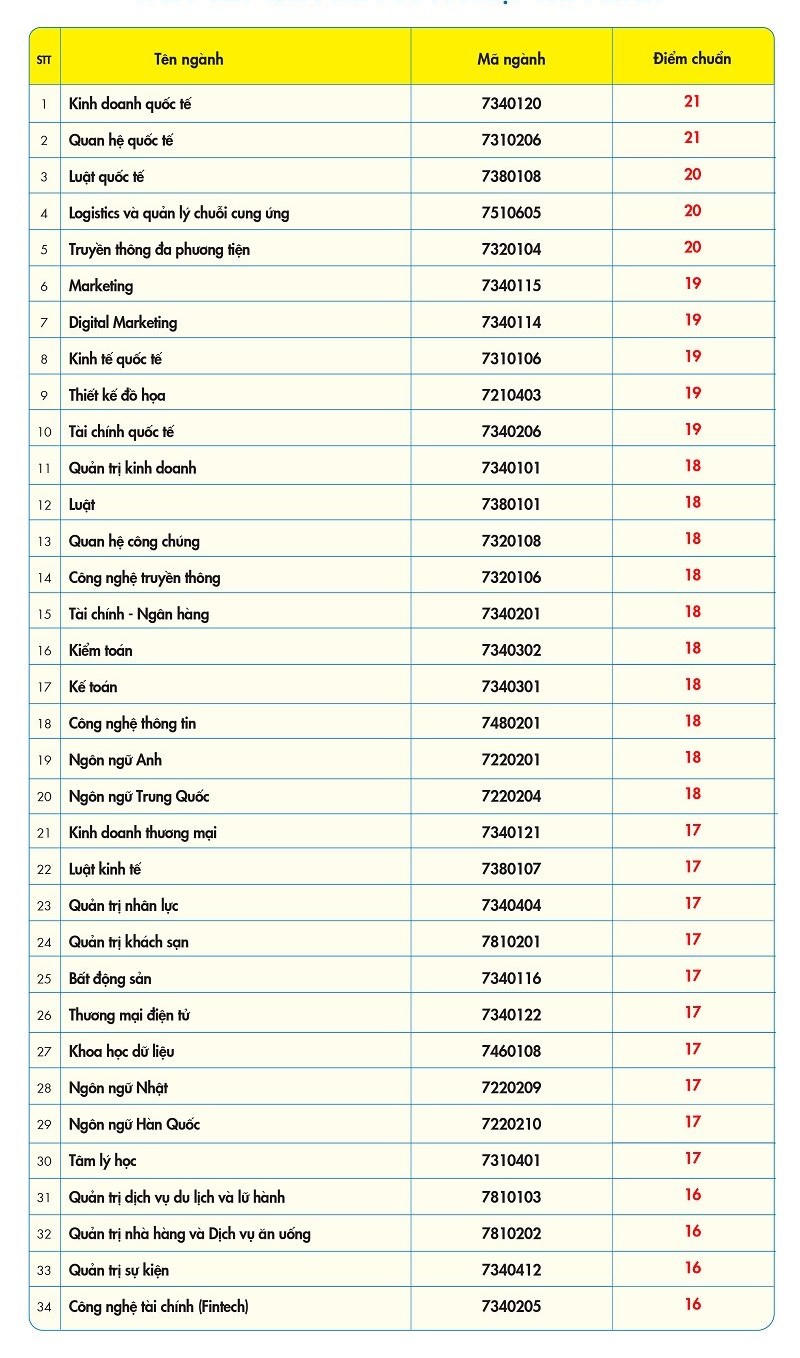 Các ngành Truyền thông đa phương tiện, Luật quốc tế, Logistics và quản lý chuỗi cung ứng có mức điểm trúng tuyển là 20. Ngành Thiết kế đồ họa, Kinh tế quốc tế, Digital Marketing, Marketing, Tài chính quốc tế có mức điểm trúng tuyển là 19. Các ngành còn lại dao động từ 16 - 18 điểm.