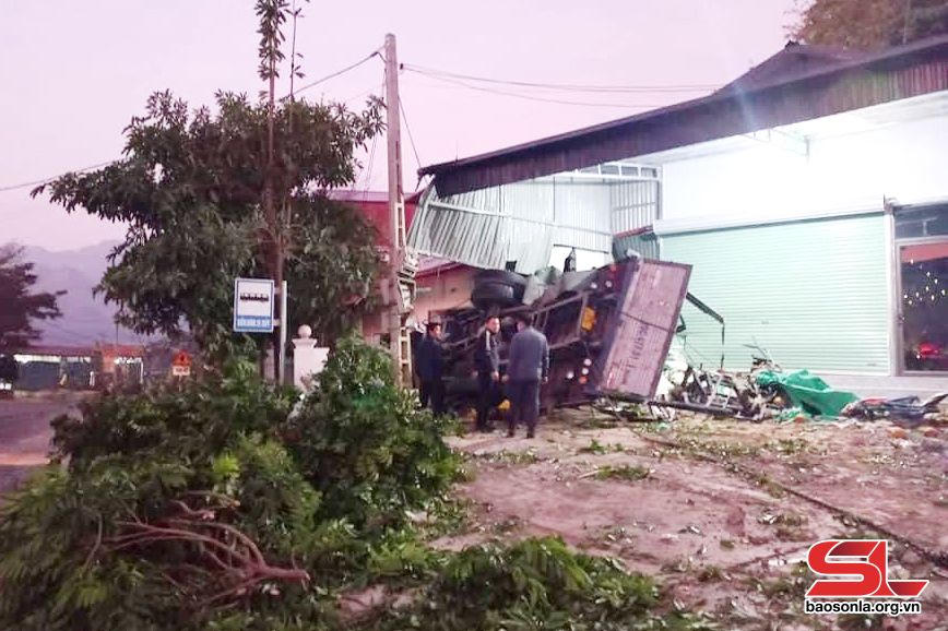 Khi đến Km201+980 đoạn cua dốc ở xã Chiềng Hắc, huyện Mộc Châu (tỉnh Sơn La), xe bất ngờ đâm đổ cây và cột điện ven đường, lao vào lật nghiêng sát cửa nhà dân, phần cabin bẹp dúm.