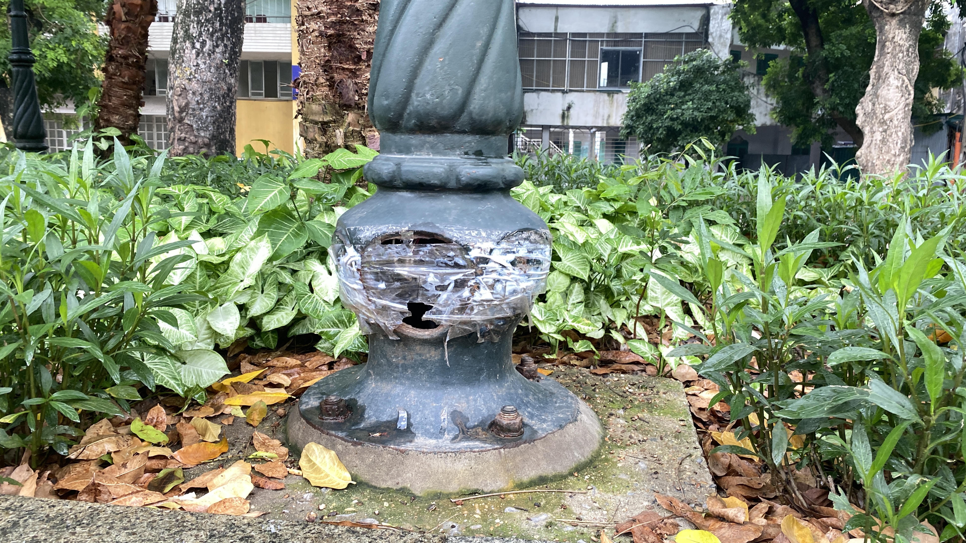 Tình trạng này diễn ra tương tự tại vườn hoa Hà Đông: Trụ nước bằng thép hoen gỉ, chân cột đèn vỡ, gạch ốp tường bong tróc…
