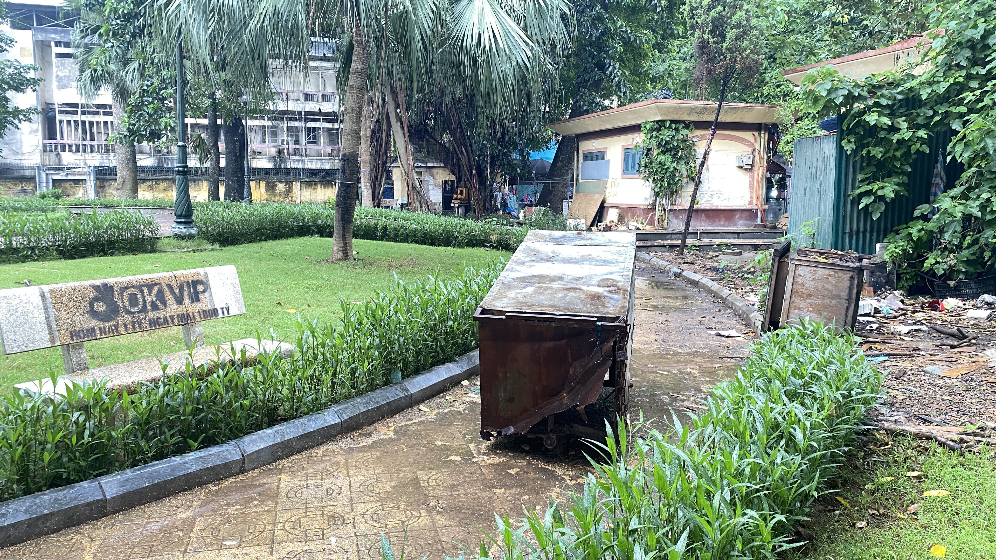 Người dân còn vứt vật dụng phế thải ngổn ngang trong khuôn viên vườn hoa.