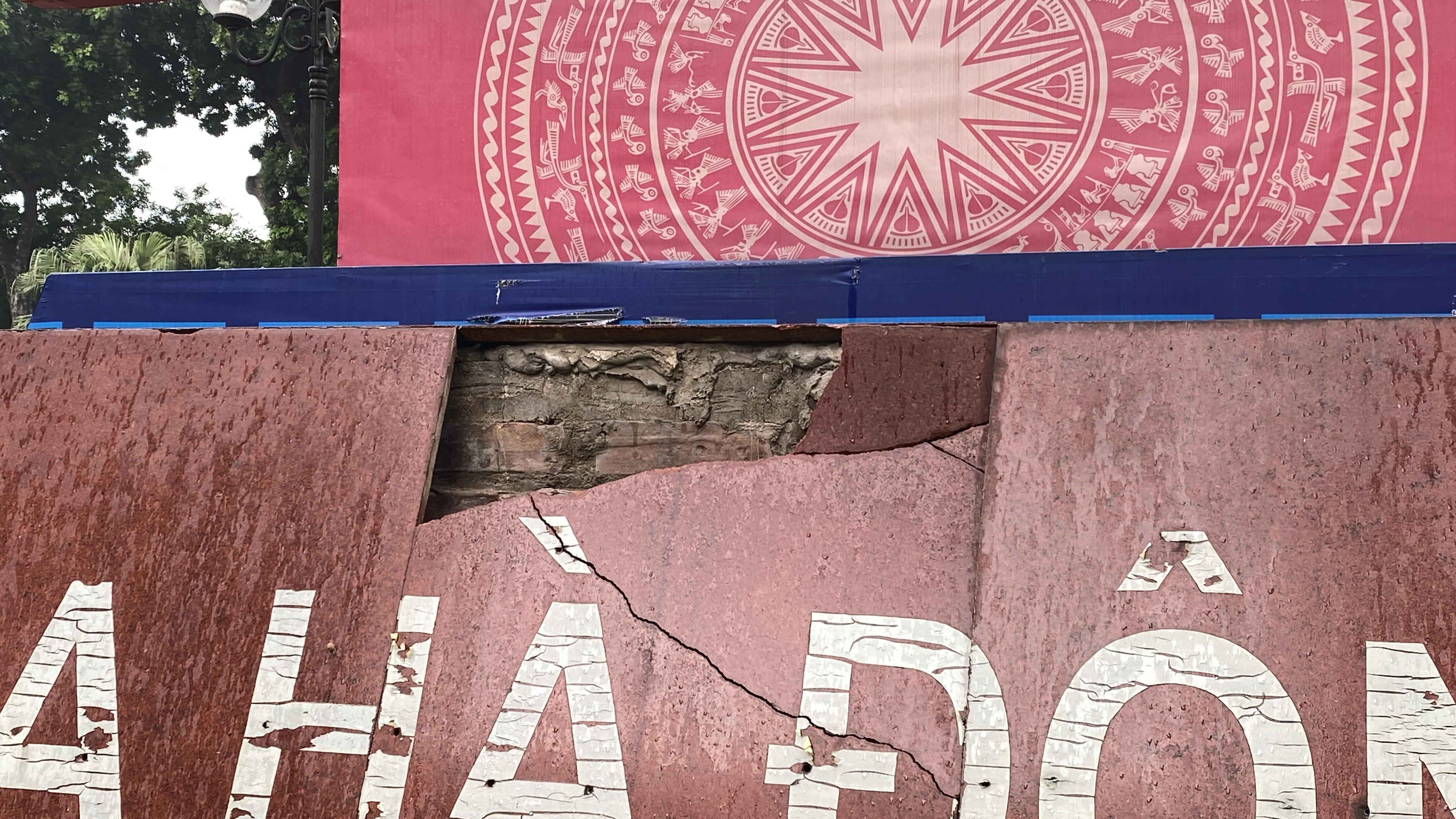 Gạch ốp tường bong tróc, gạch lát nền vỡ vụn, ghế đá gãy hỏng, rác thải khắp nơi. |