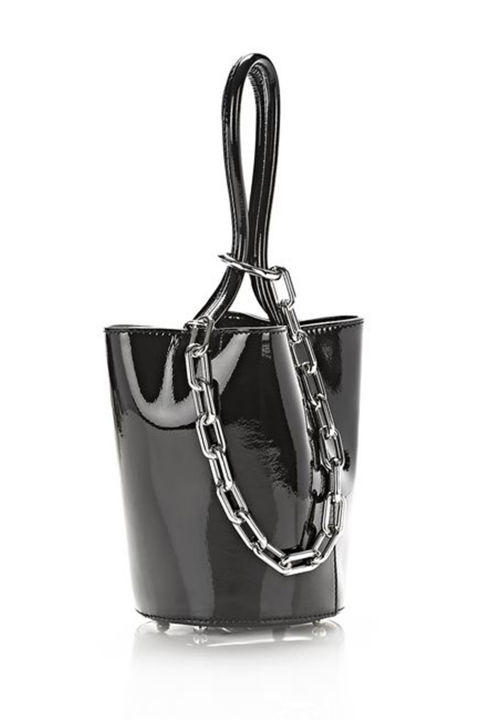 Sang trọng nhưng cũng phá cách cùng chất liệu da bóng và phối dây xích bản to: Alexander Wang Mini Bucket.