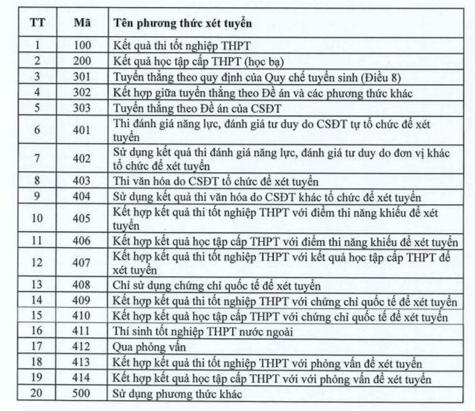 Danh mục phương thức xét tuyển do Bộ GD&ĐT quy định: