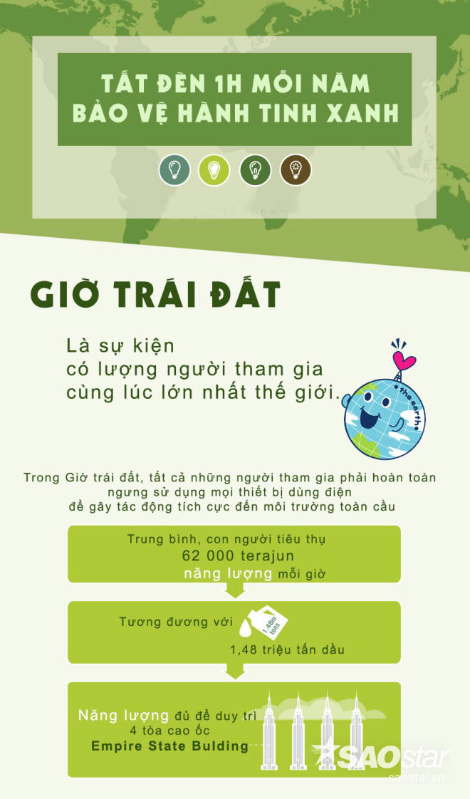 Đây là năm thứ 8 Việt Nam tham gia chiến dịch Giờ trái đất với rất nhiều hoạt động có ý nghĩa như kêu gọi tắt các thiết bị điện khi không sử dụng, tiết kiệm nước, trồng thêm cây xanh, đạp xe chống biến đổi khí hậu...