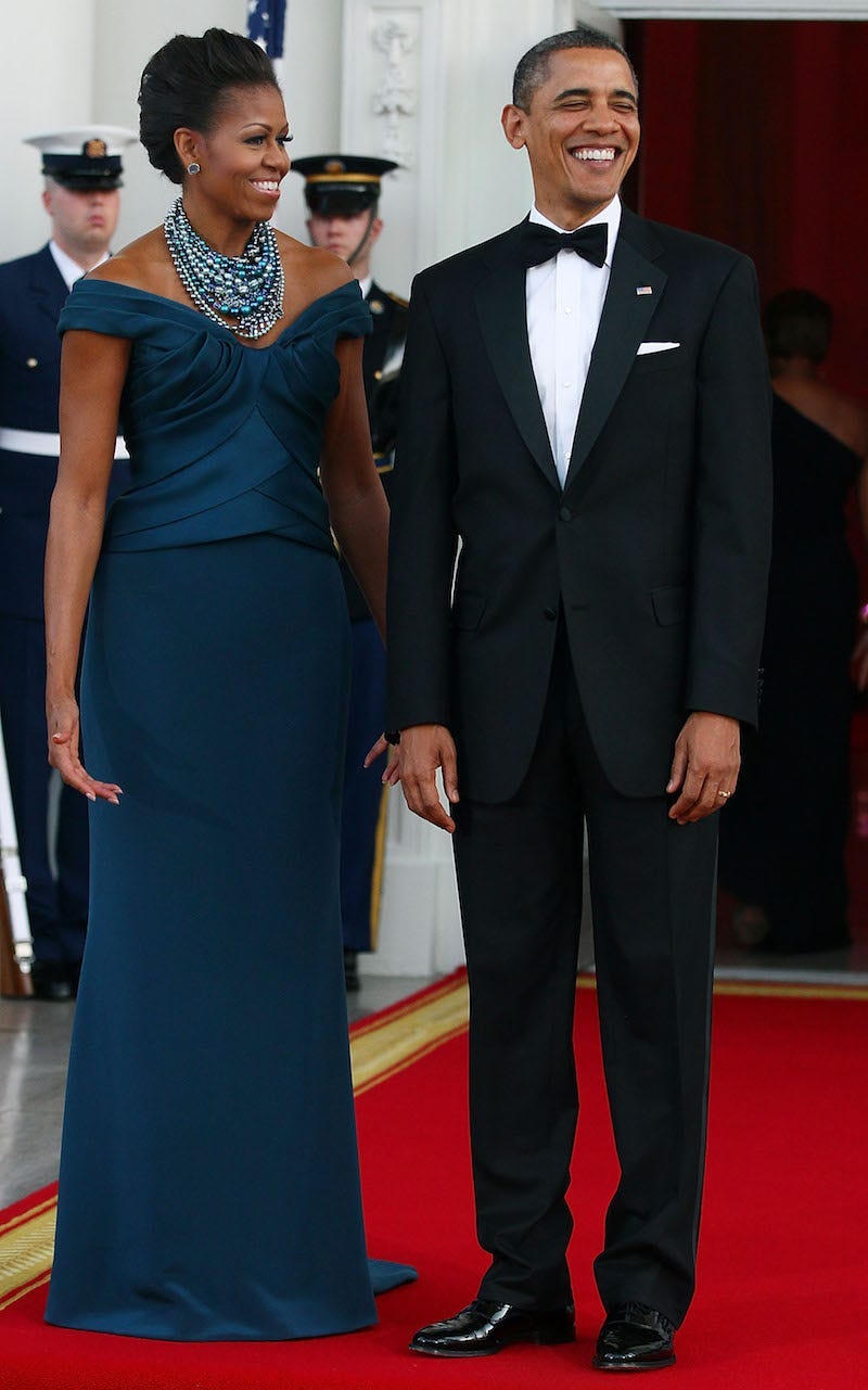 Năm 2012, bà Michelle Obama mặc một chiếc áo choàng màu xanh đơn giản nhưng kết hợp nó với một chiếc vòng cổ.