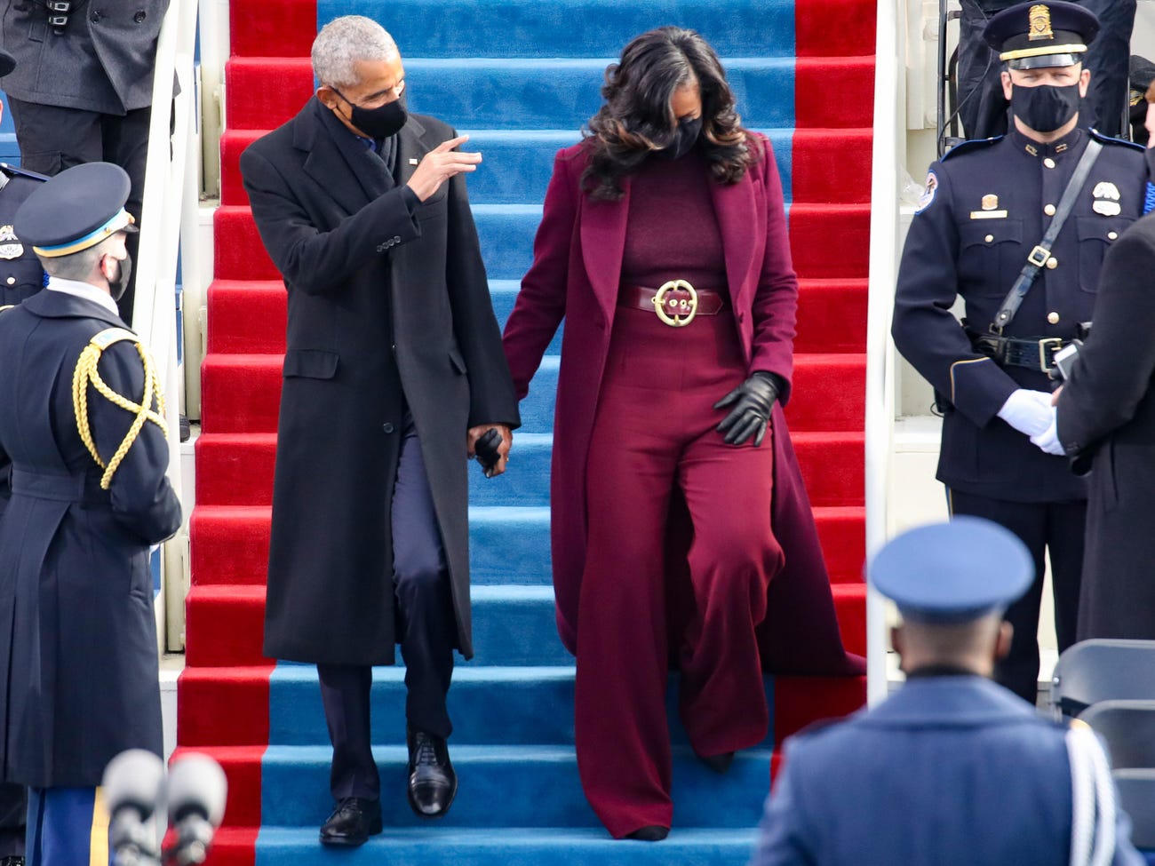 Tại lễ nhậm chức của Tổng thống Joe Biden năm 2021, bà Michelle Obama mặc bộ cánh tông đỏ mận.