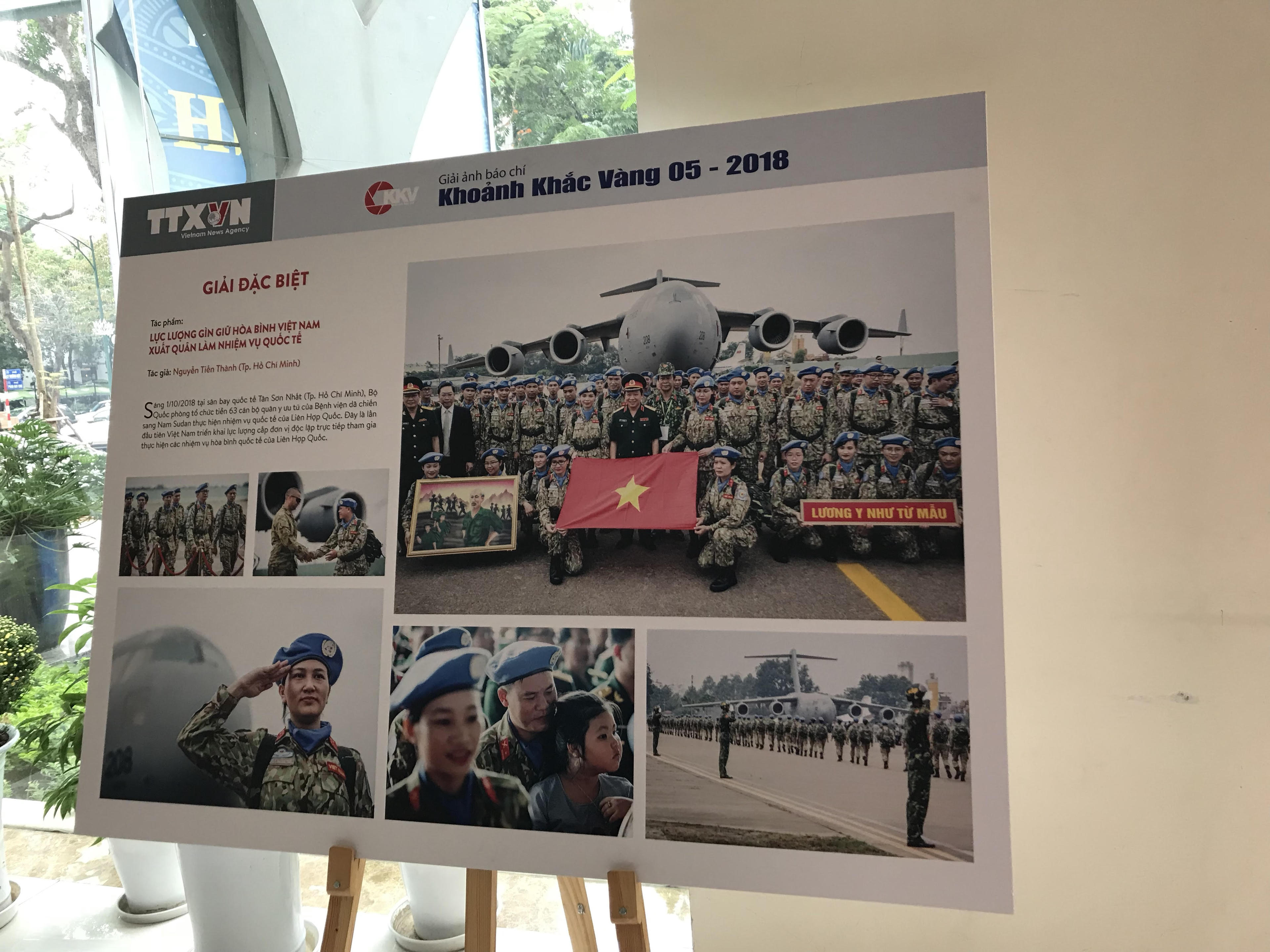 Giải đặc biệt (35 triệu đồng) dành cho tay máy trẻ Nguyễn Tiến Thành với tác phẩm: “Lực lượng gìn giữ hòa bình Việt Nam xuất quân làm nhiệm vụ quốc tế” - bộ ảnh mang tính hội nhập cao với cách thể hiện bài bản, cấu trúc hợp lý. Sự kiện đội tuyển Việt Nam đăng quang tại AFF Cup 2018 được ghi nhận với giải nhất ảnh đơn cho tác phẩm “Bay cao trong chiến thắng” của Trần Thanh Hải ghi lại khoảnh khắc các cầu thủ tung hô HLV Park Hang-seo.