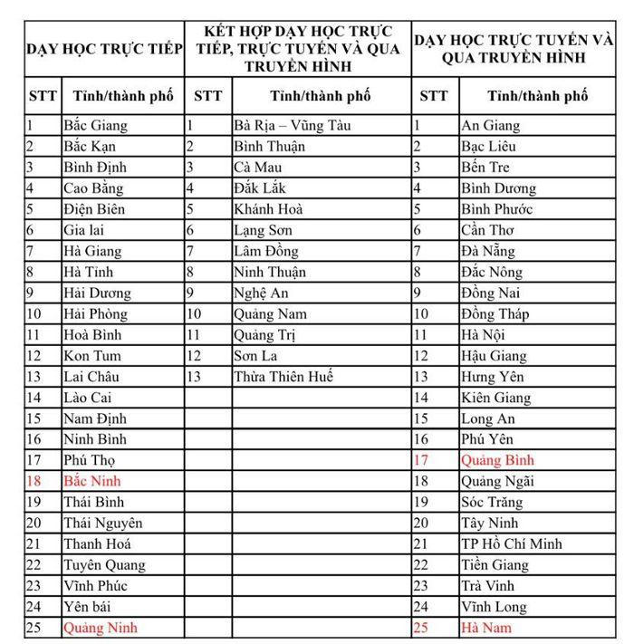 Có 13 tỉnh, thành đang áp dụng cả hình thức dạy học trực tiếp, dạy học trực tuyến và qua truyền hình gồm: Lạng Sơn, Sơn La, Nghệ An, Quảng Trị, Thừa Thiên Huế, Quảng Nam, Khánh Hòa, Ninh Thuận, Bình Thuận, Lâm Đồng, Đắk Lắk, Bà Rịa - Vũng Tàu, Cà Mau. Đây là những địa phương thực hiện phương án cho học sinh ở "vùng xanh" đi học tại trường, những học sinh ở vùng chưa an toàn tiếp tục học trực tuyến, qua truyền hình.