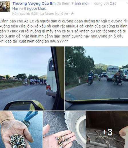 Sáng ngày 24/7, trên trang cá nhân của facebook anh Lê Văn Thanh (trú tại Diễn Châu, Nghệ An) đăng tải dòng trạng thái về việc xe ô tô của anh bị xịt lốp vì dính đinh trên đoạn đường tỉnh lộ 536 nối Quốc lộ 1A (xã Diễn An, Diễn Châu) đi qua Khu công nghiệp Nam Cấm xuống thị xã Cửa Lò.